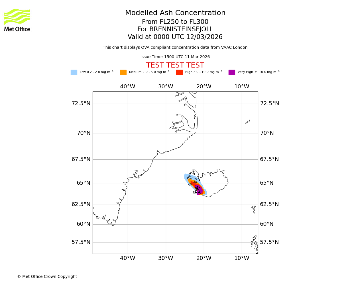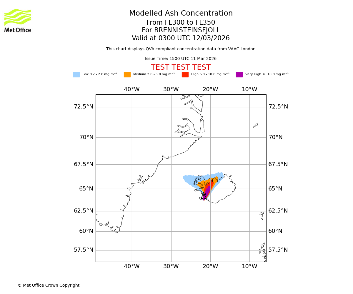 Modelled ash concentration from 300 to 350 for BRENNISTEINSFJOLL. Valid at 0000 UTC 12/03/2026