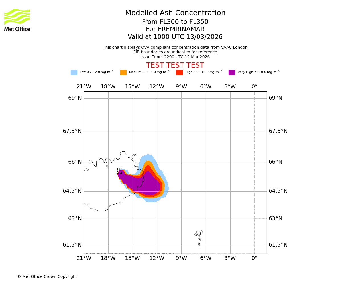 Modelled ash concentration from 300 to 350 for FREMRINAMAR. Valid at 0700 UTC 13/03/2026