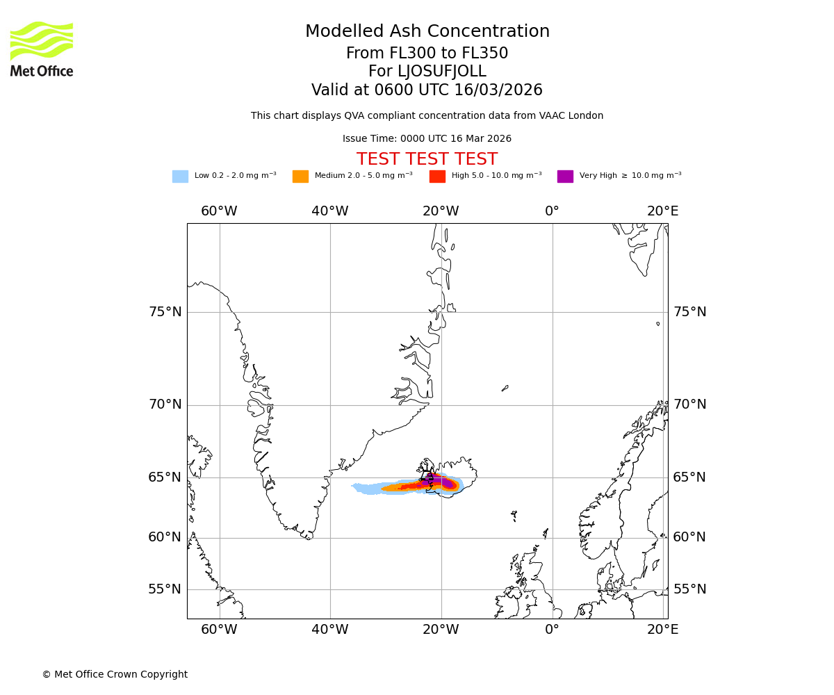 Modelled ash concentration from 300 to 350 for LJOSUFJOLL. Valid at 0300 UTC 16/03/2026