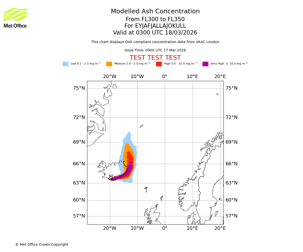 Modelled ash concentration from 300 to 350 for EYJAFJALLAJOKULL. Valid at 0000 UTC 18/03/2026