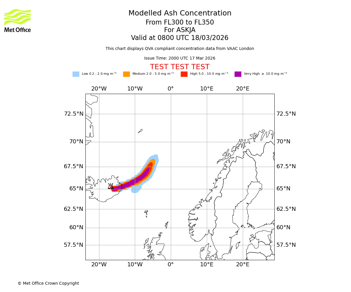 Modelled ash concentration from 300 to 350 for ASKJA. Valid at 0500 UTC 18/03/2026