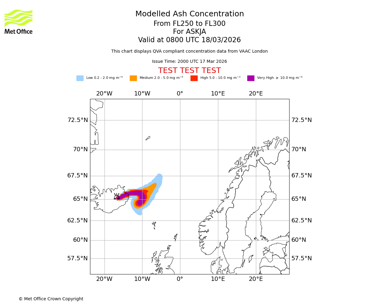 Modelled ash concentration from 000 to 200 for ASKJA. Valid at 2000 UTC 17/03/2026