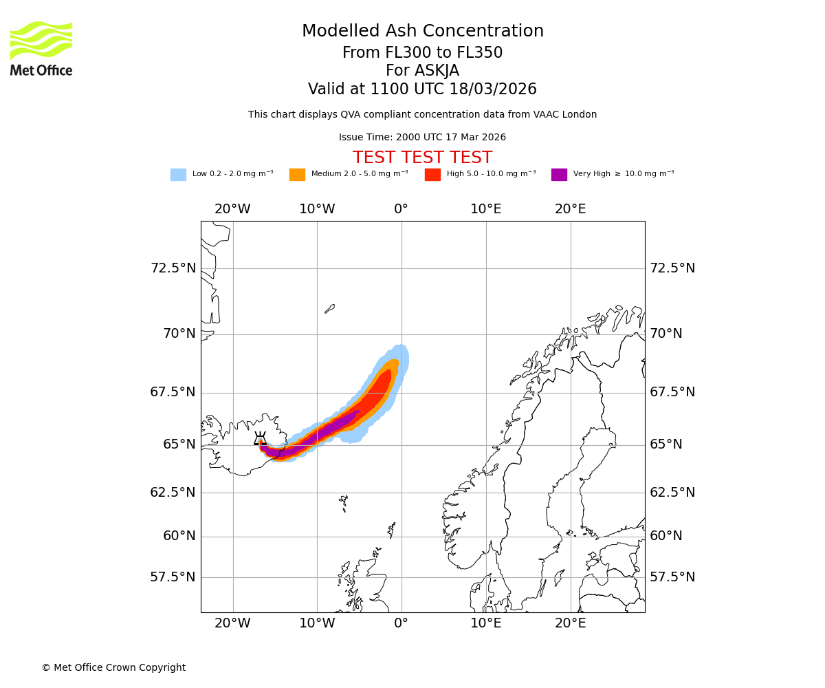 Modelled ash concentration from 300 to 350 for ASKJA. Valid at 0800 UTC 18/03/2026