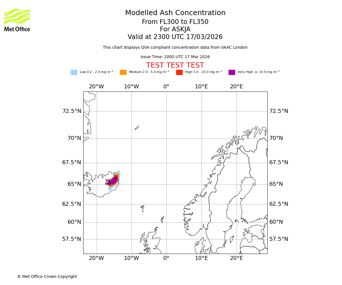 Modelled ash concentration from 300 to 350 for ASKJA. Valid at 2000 UTC 17/03/2026