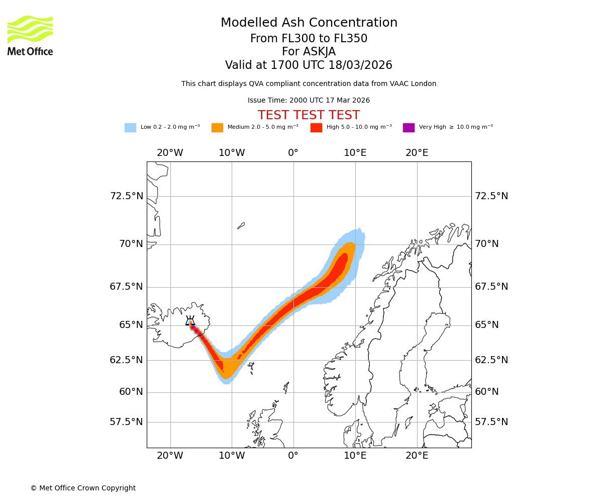 Modelled ash concentration from 300 to 350 for ASKJA. Valid at 1400 UTC 18/03/2026