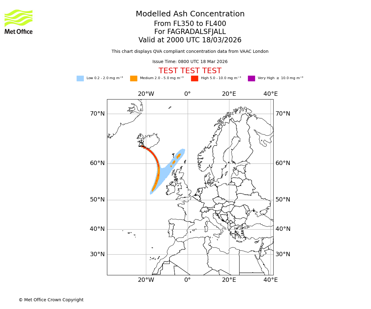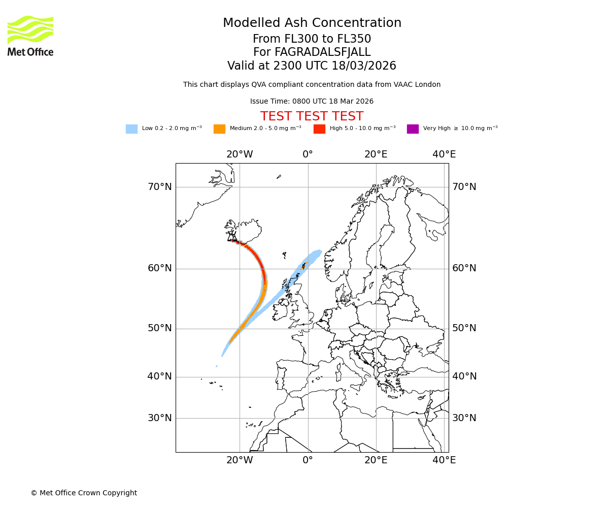Modelled ash concentration from 300 to 350 for FAGRADALSFJALL. Valid at 2000 UTC 18/03/2026