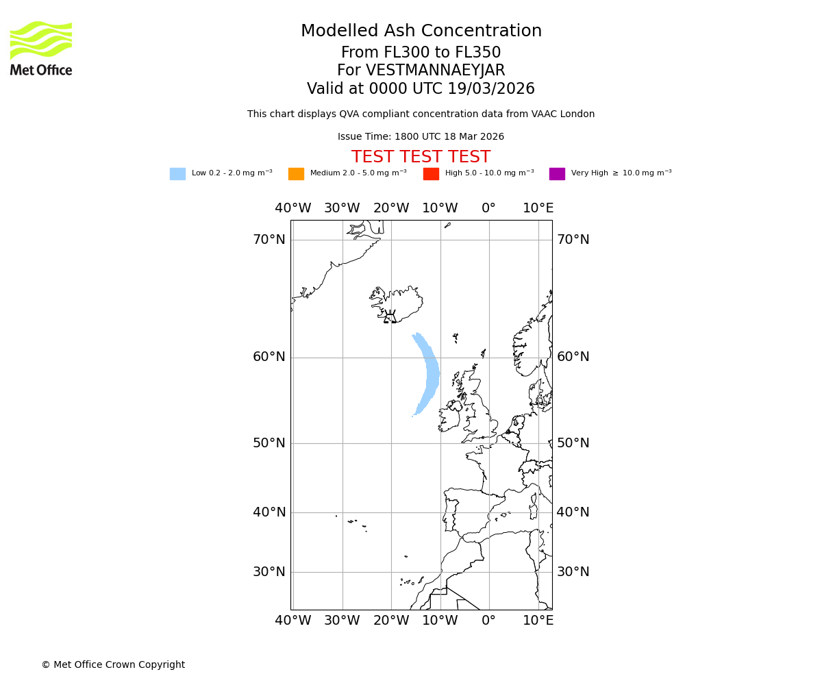 Modelled ash concentration from 300 to 350 for VESTMANNAEYJAR. Valid at 2100 UTC 18/03/2026