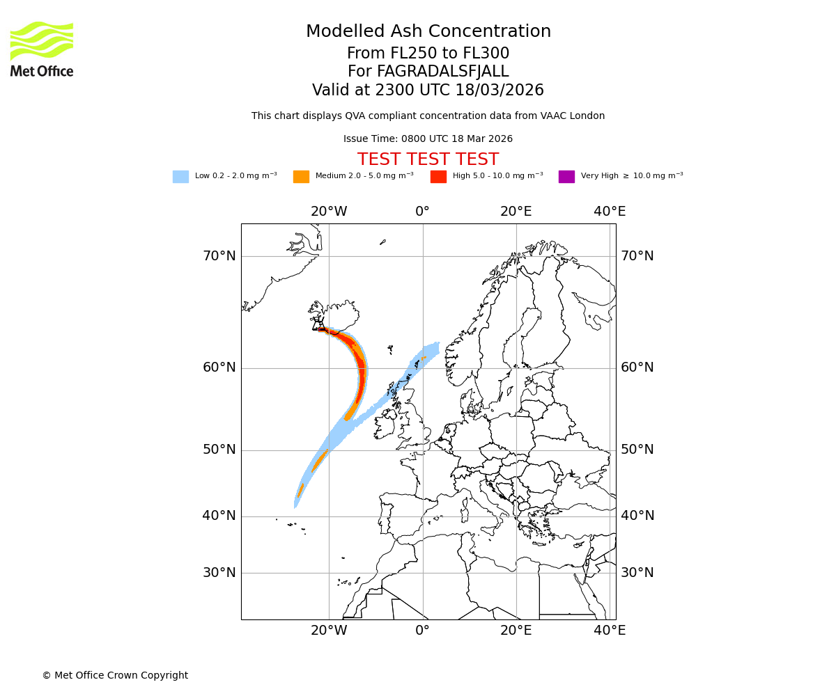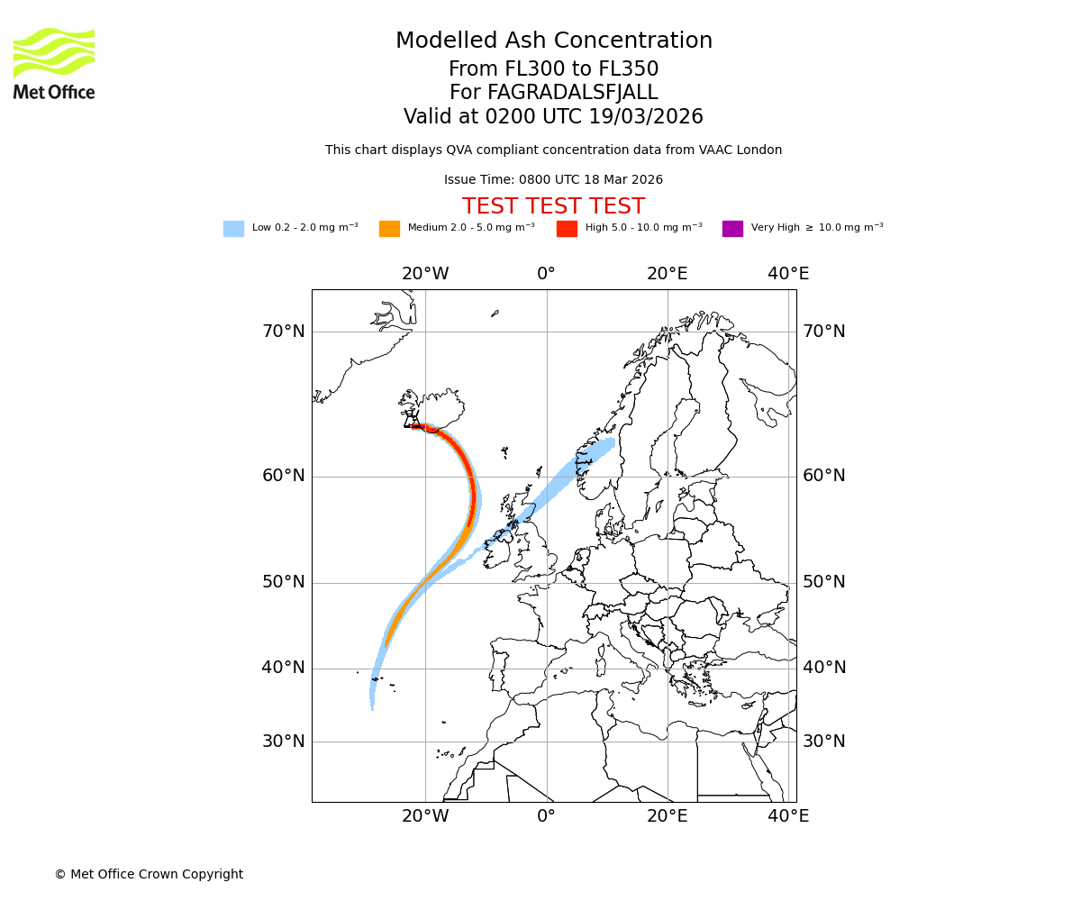 Modelled ash concentration from 300 to 350 for FAGRADALSFJALL. Valid at 2300 UTC 18/03/2026