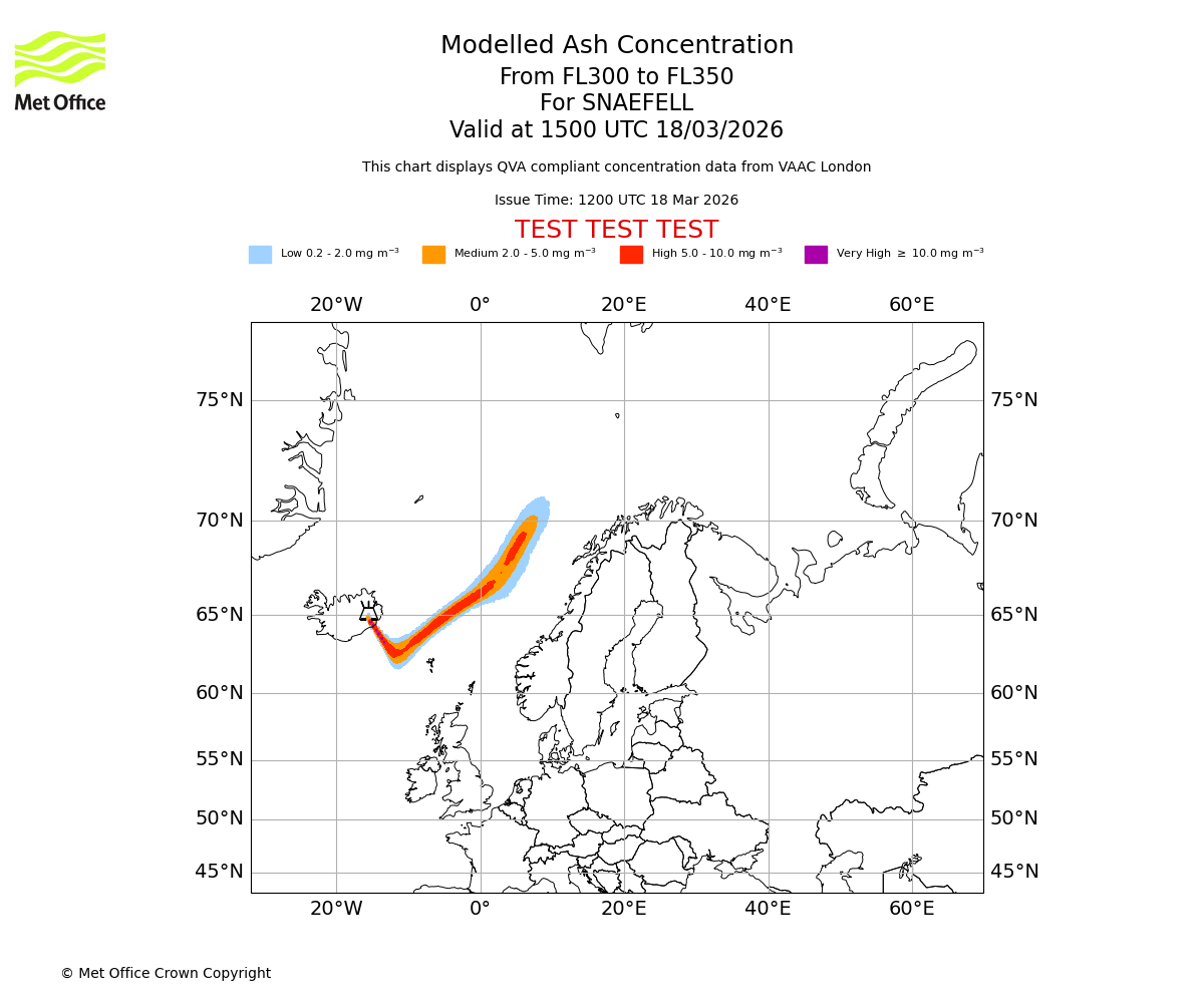 Modelled ash concentration from 300 to 350 for SNAEFELL. Valid at 1200 UTC 18/03/2026