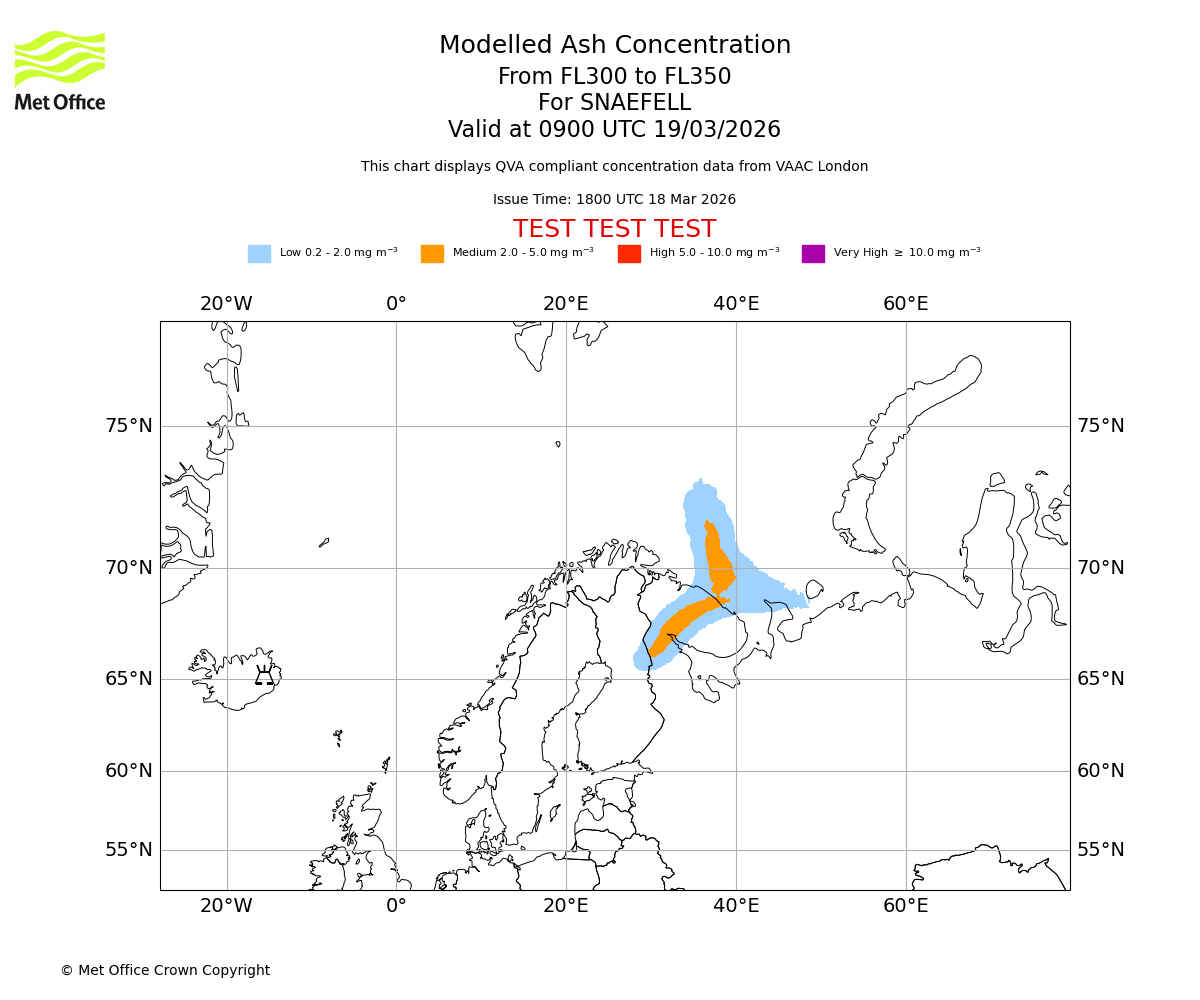Modelled ash concentration from 300 to 350 for SNAEFELL. Valid at 0600 UTC 19/03/2026
