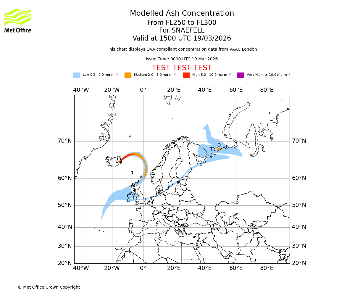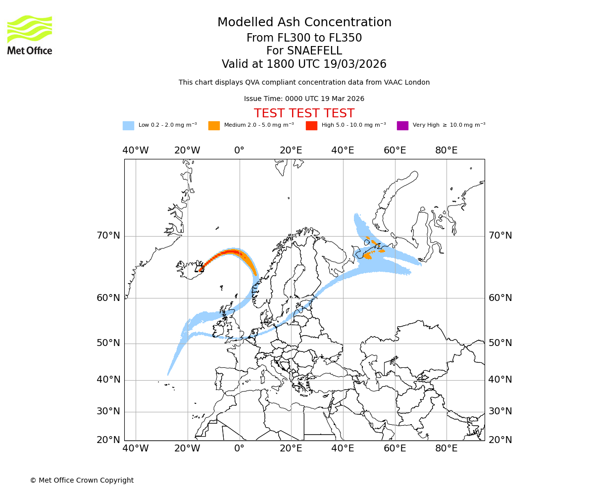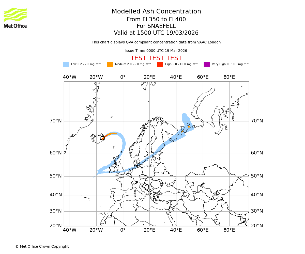 Modelled ash concentration from 300 to 350 for SNAEFELL. Valid at 1500 UTC 19/03/2026