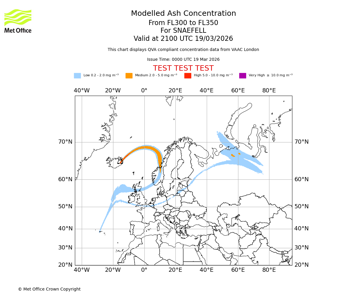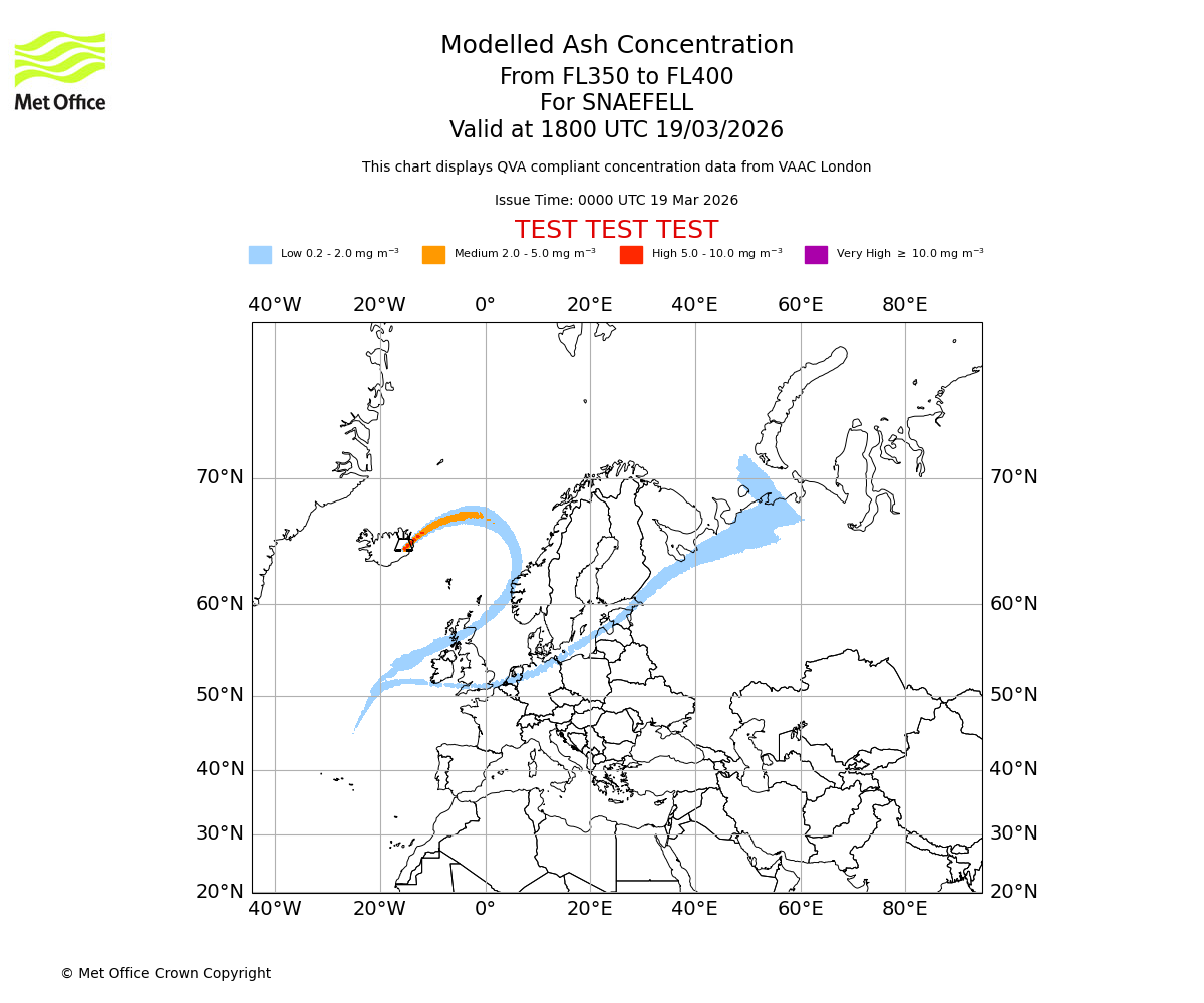 Modelled ash concentration from 300 to 350 for SNAEFELL. Valid at 1800 UTC 19/03/2026