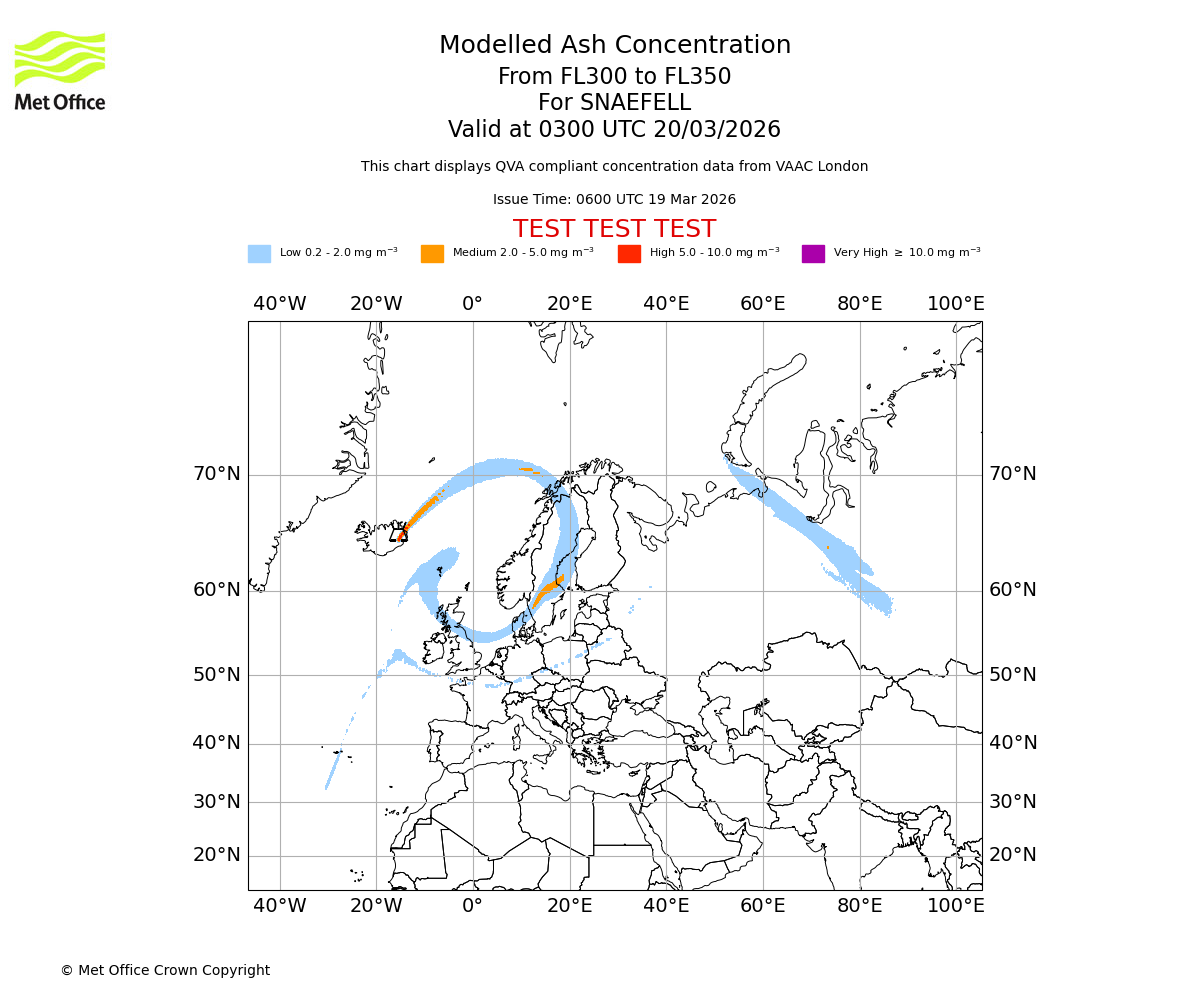 Modelled ash concentration from 300 to 350 for SNAEFELL. Valid at 0000 UTC 20/03/2026