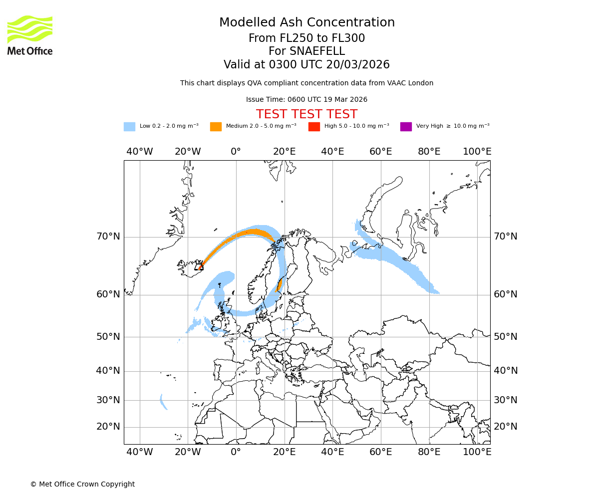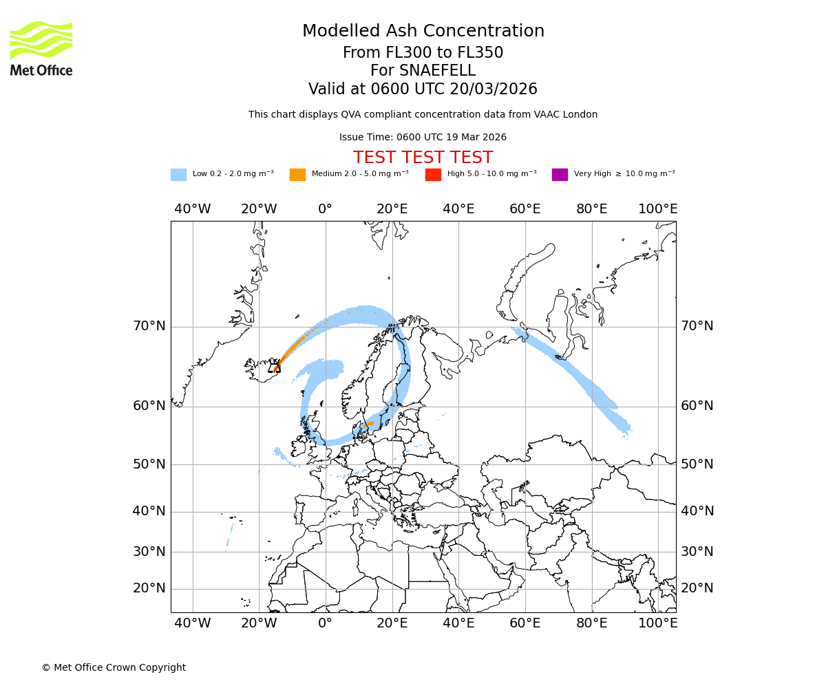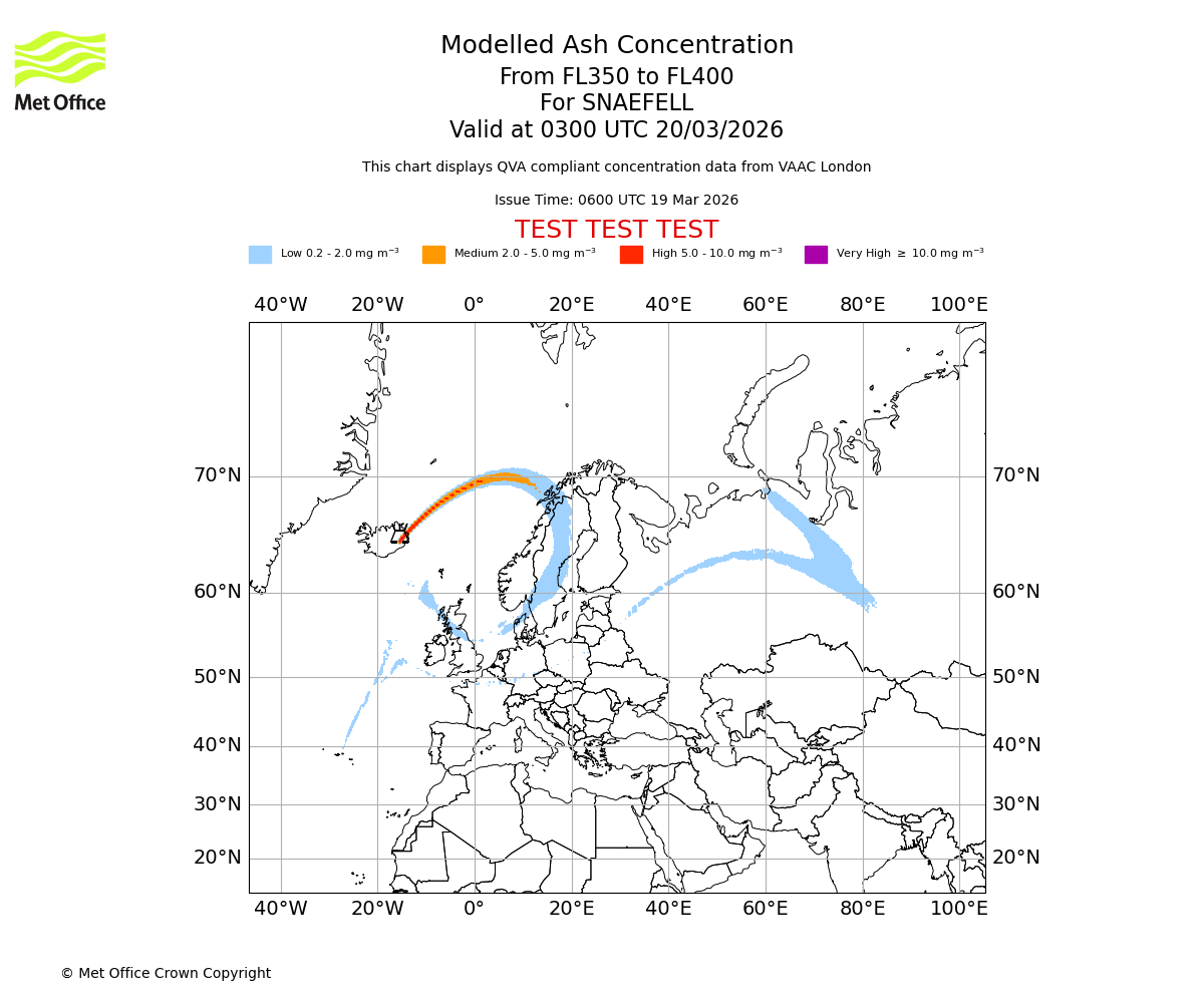 Modelled ash concentration from 300 to 350 for SNAEFELL. Valid at 0300 UTC 20/03/2026