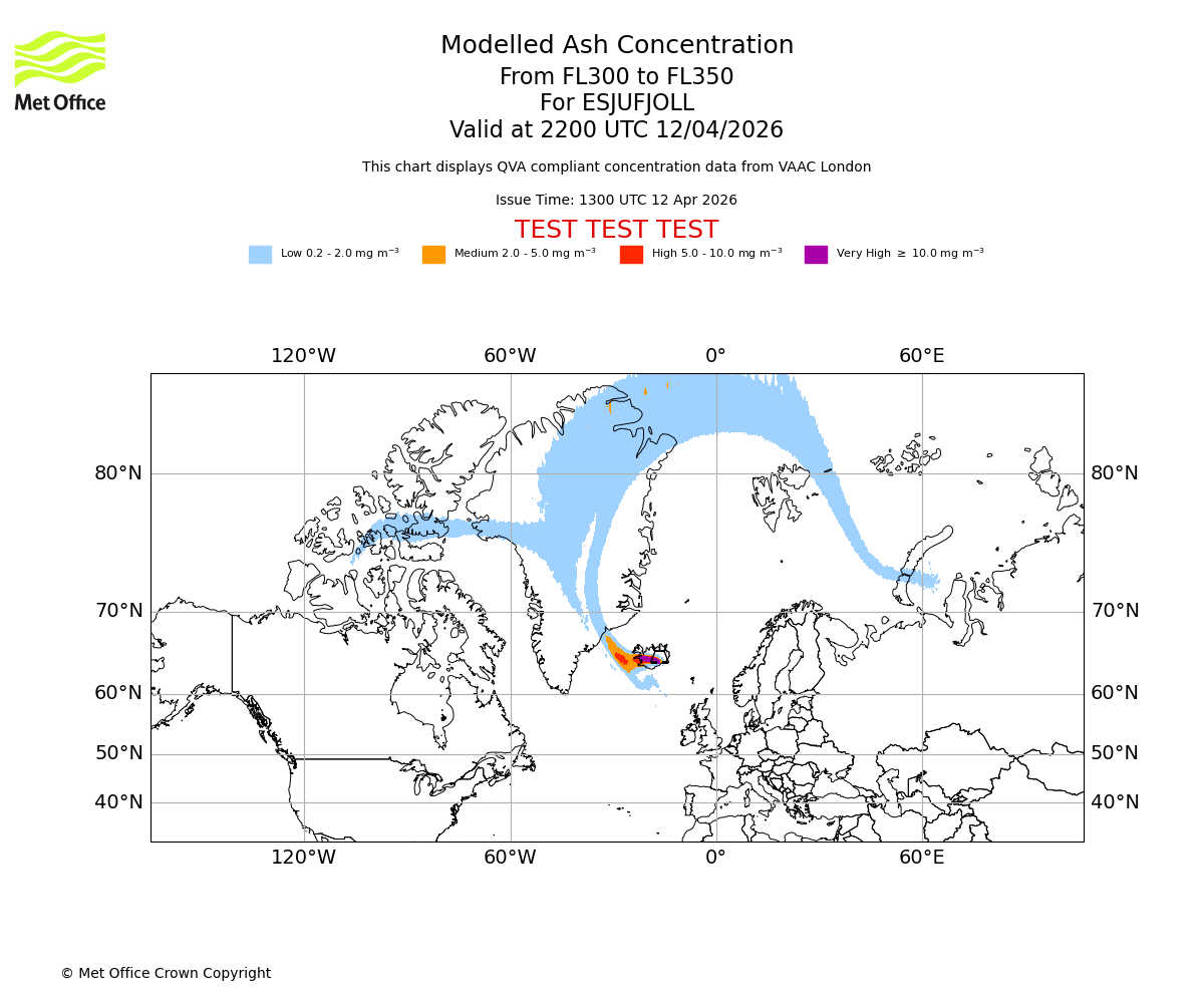Modelled ash concentration from 300 to 350 for ESJUFJOLL. Valid at 1900 UTC 12/04/2026