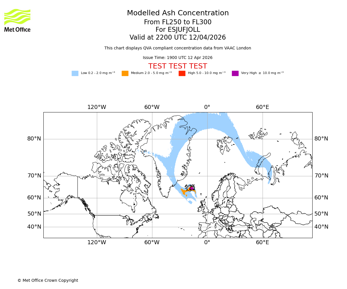Modelled ash concentration from 000 to 200 for ESJUFJOLL. Valid at 1900 UTC 12/04/2026