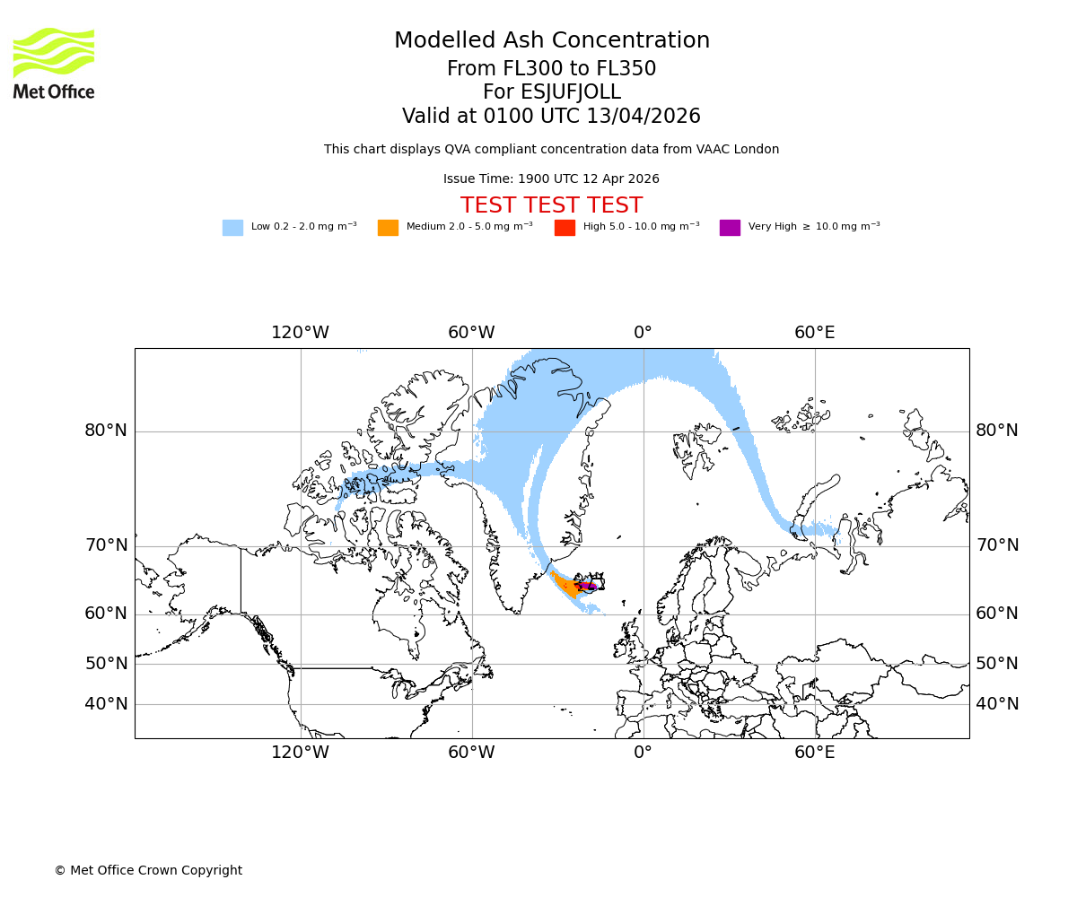 Modelled ash concentration from 300 to 350 for ESJUFJOLL. Valid at 2200 UTC 12/04/2026