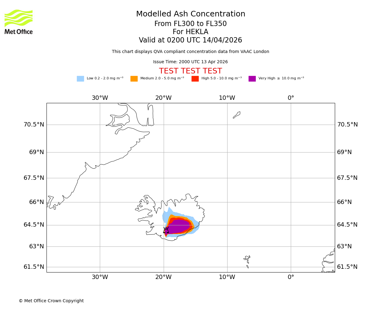 Modelled ash concentration from 300 to 350 for HEKLA. Valid at 2300 UTC 13/04/2026