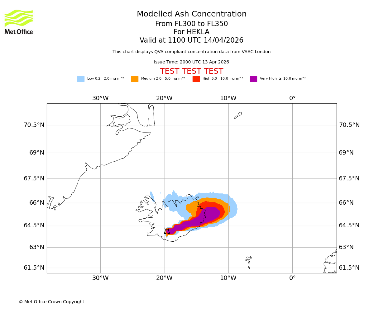 Modelled ash concentration from 300 to 350 for HEKLA. Valid at 0800 UTC 14/04/2026