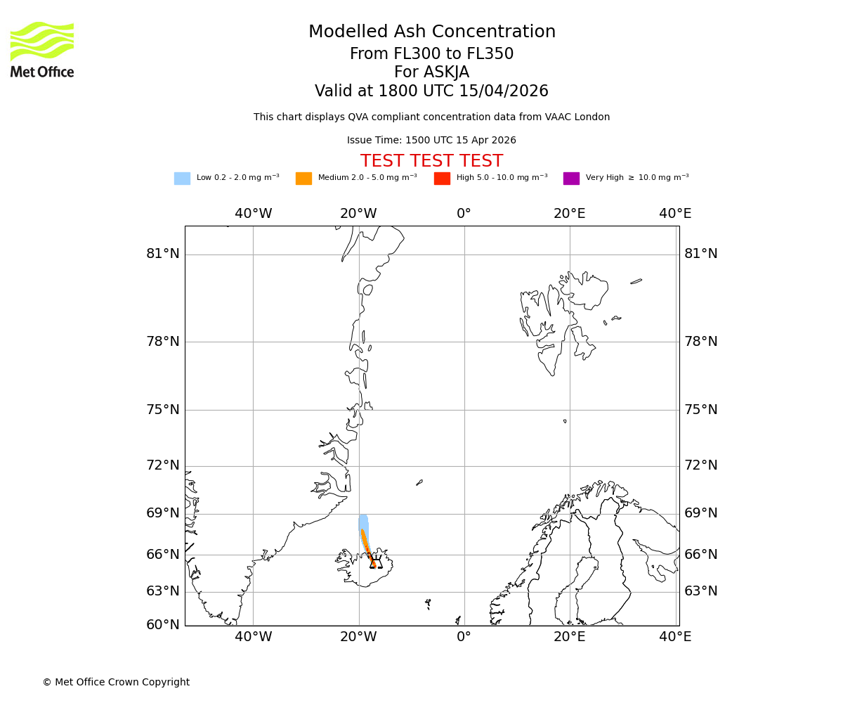 Modelled ash concentration from 300 to 350 for ASKJA. Valid at 1500 UTC 15/04/2026