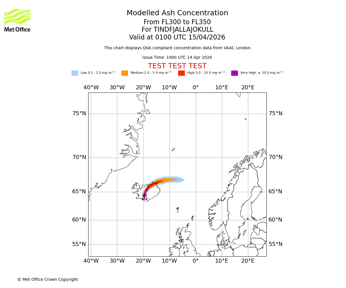 Modelled ash concentration from 300 to 350 for TINDFJALLAJOKULL. Valid at 2200 UTC 14/04/2026