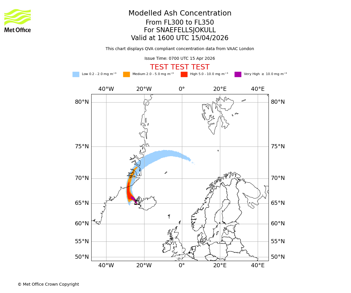 Modelled ash concentration from 300 to 350 for SNAEFELLSJOKULL. Valid at 1300 UTC 15/04/2026