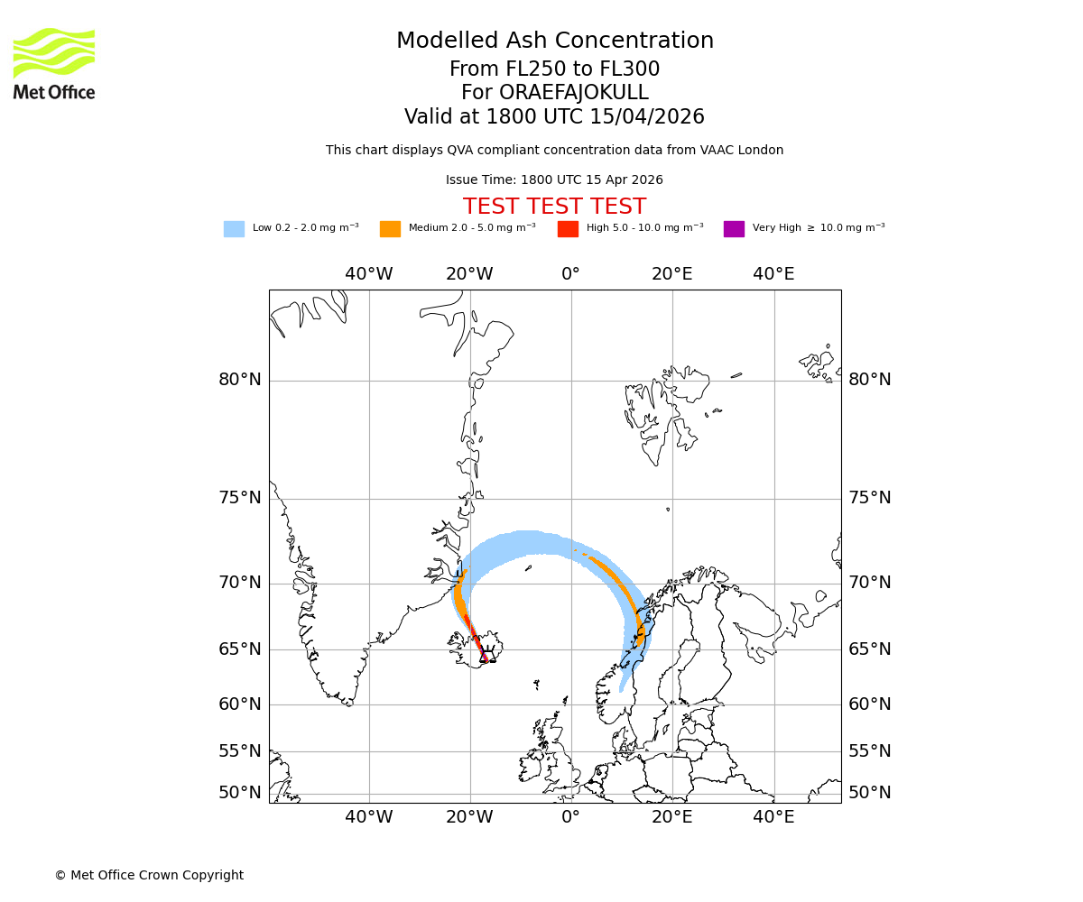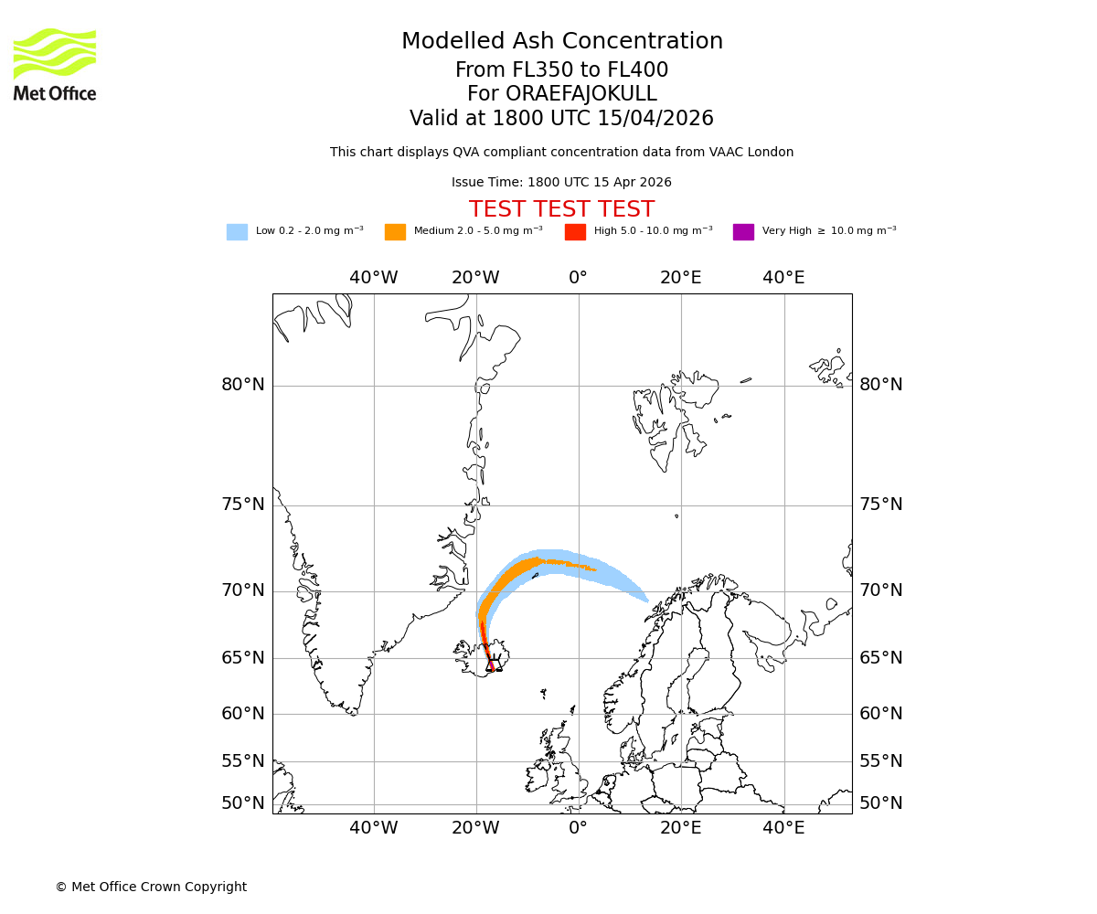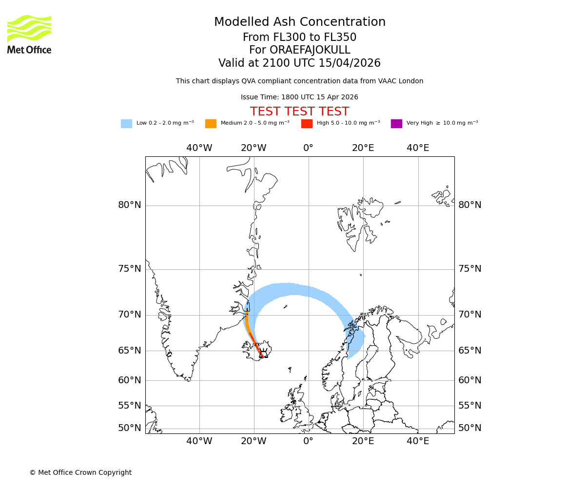 Modelled ash concentration from 300 to 350 for ORAEFAJOKULL. Valid at 1800 UTC 15/04/2026