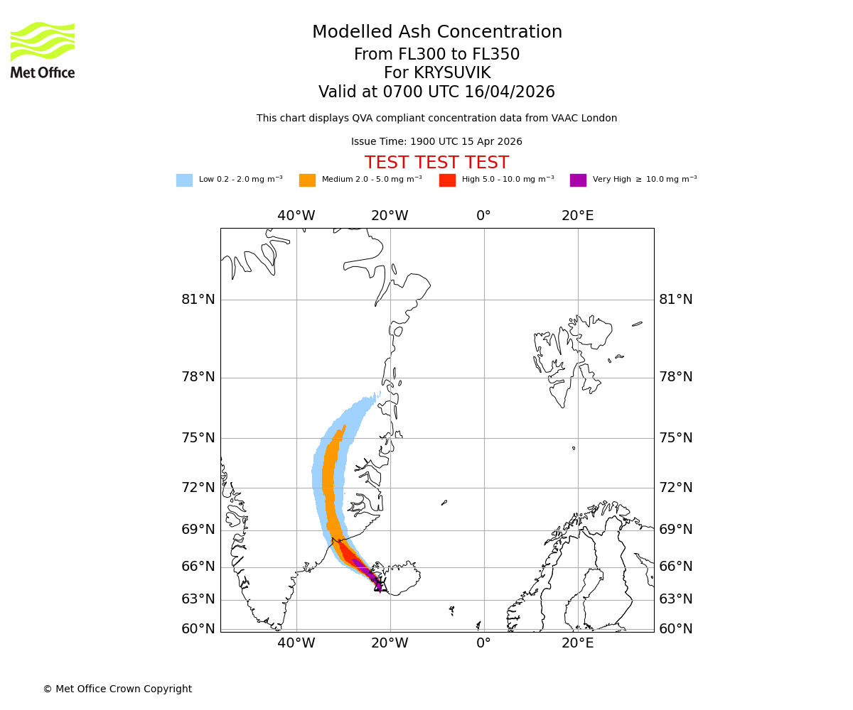 Modelled ash concentration from 300 to 350 for KRYSUVIK. Valid at 0400 UTC 16/04/2026