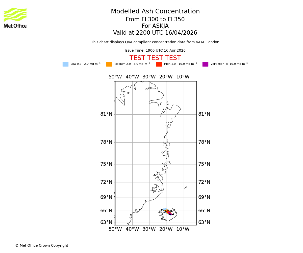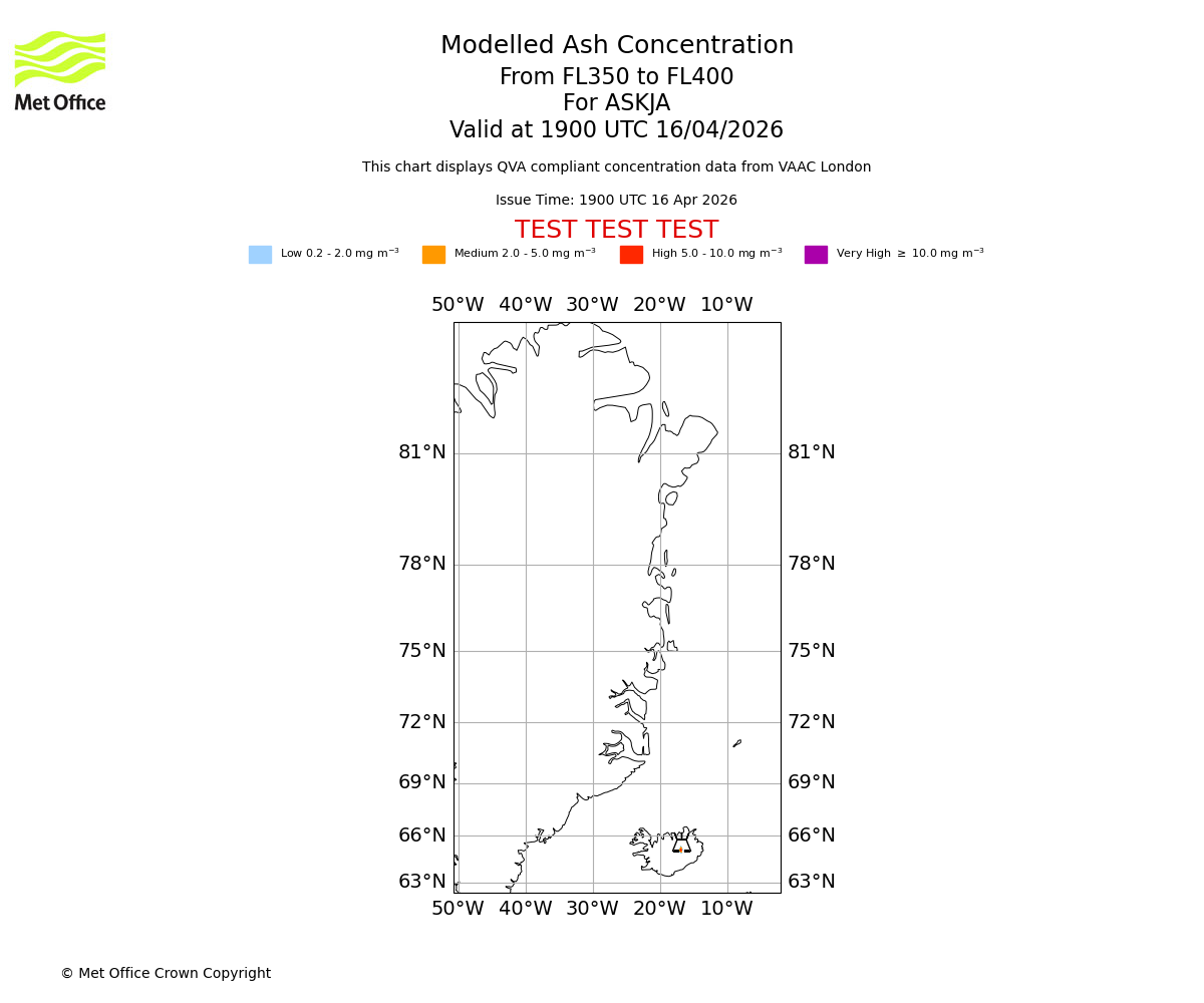 Modelled ash concentration from 300 to 350 for ASKJA. Valid at 1900 UTC 16/04/2026