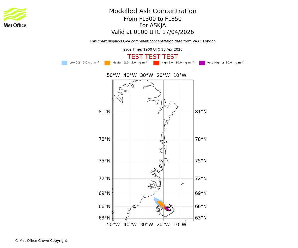 Modelled ash concentration from 300 to 350 for ASKJA. Valid at 2200 UTC 16/04/2026