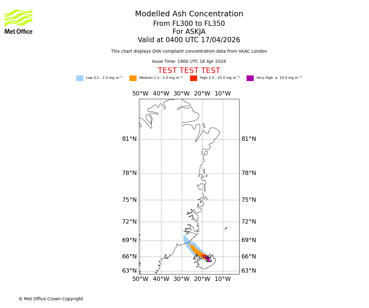 Modelled ash concentration from 300 to 350 for ASKJA. Valid at 0100 UTC 17/04/2026