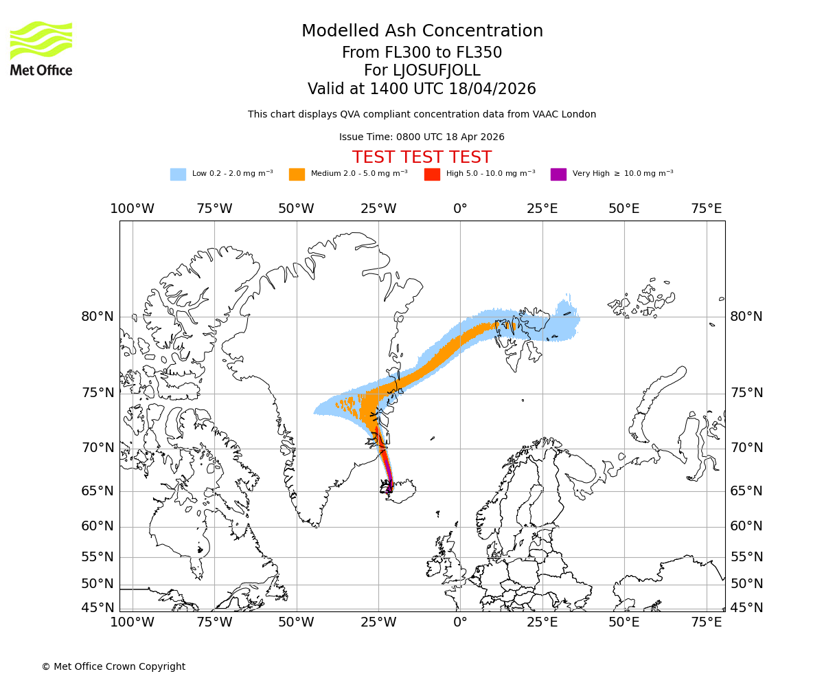 Modelled ash concentration from 300 to 350 for LJOSUFJOLL. Valid at 1100 UTC 18/04/2026