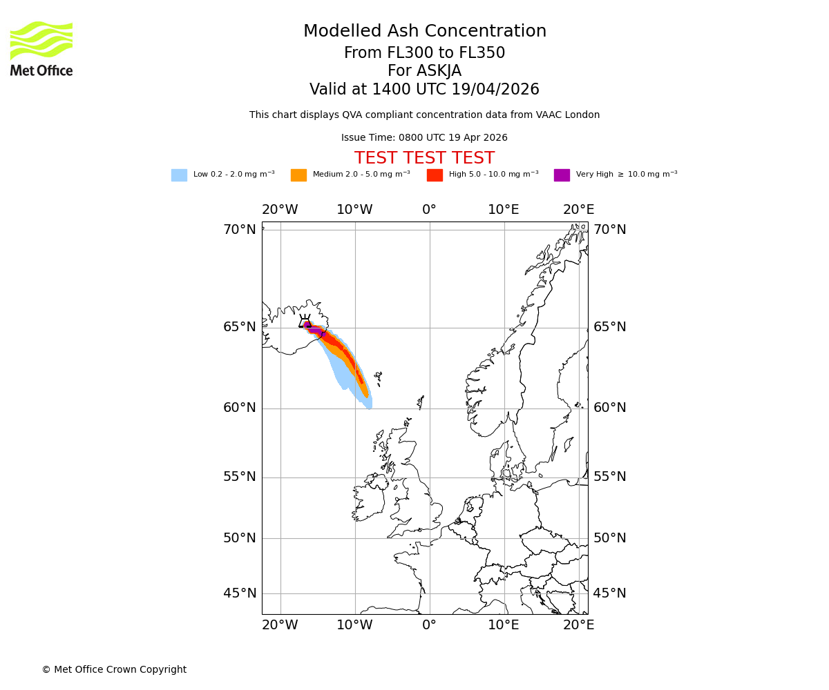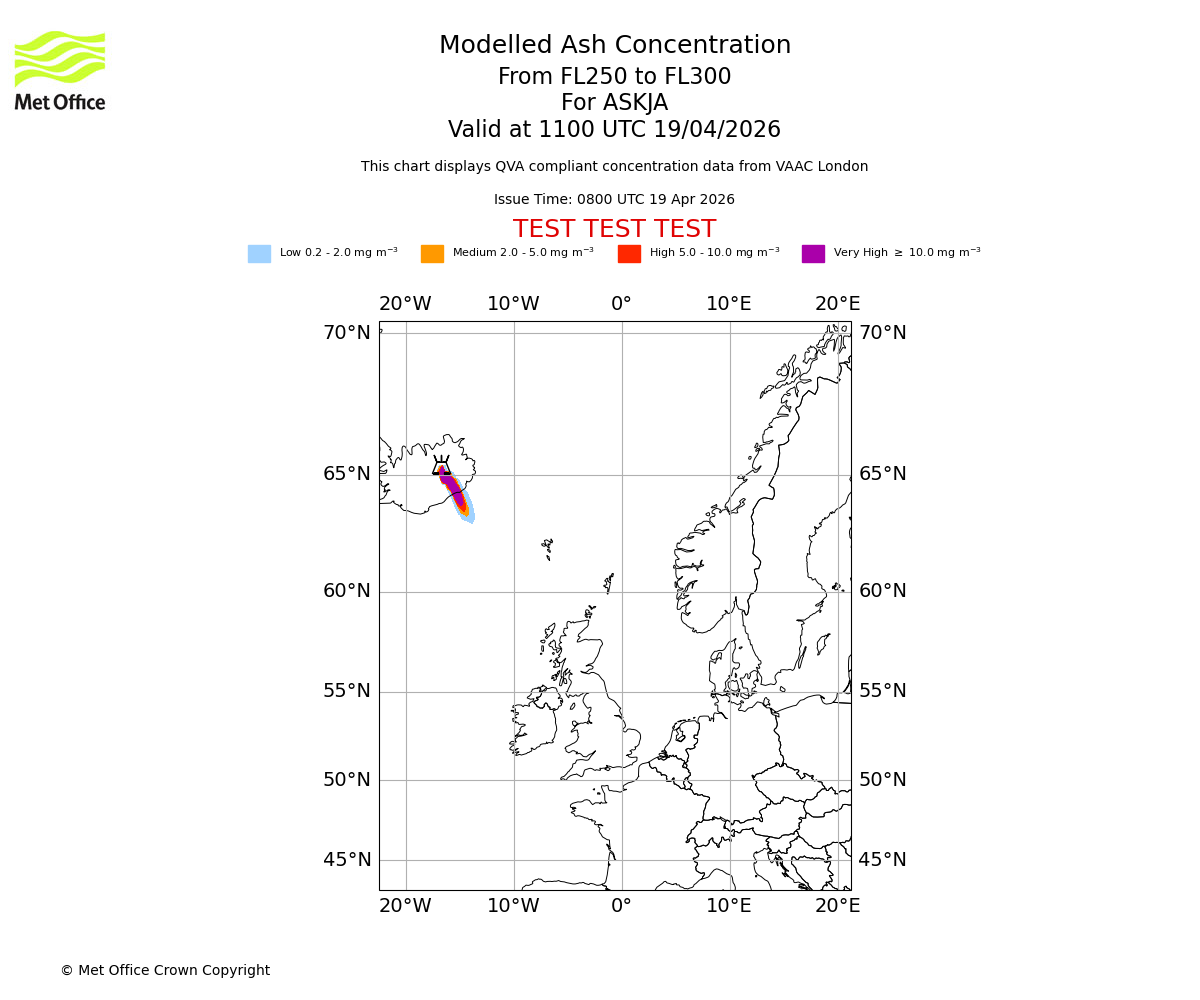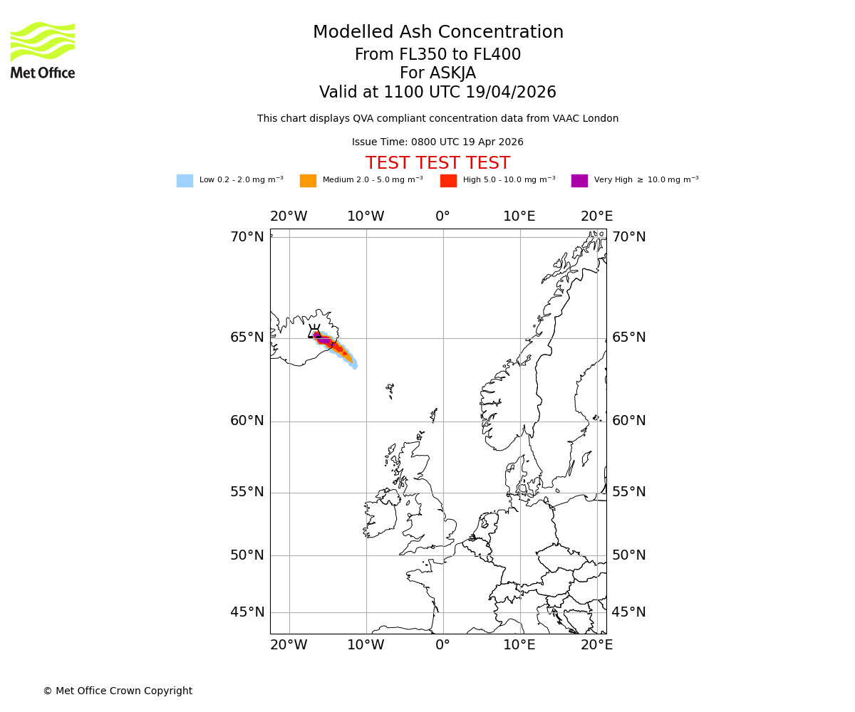 Modelled ash concentration from 300 to 350 for ASKJA. Valid at 1100 UTC 19/04/2026
