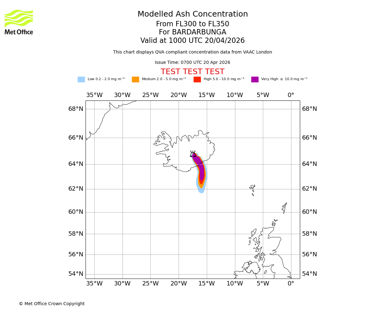 Modelled ash concentration from 300 to 350 for BARDARBUNGA. Valid at 0700 UTC 20/04/2026