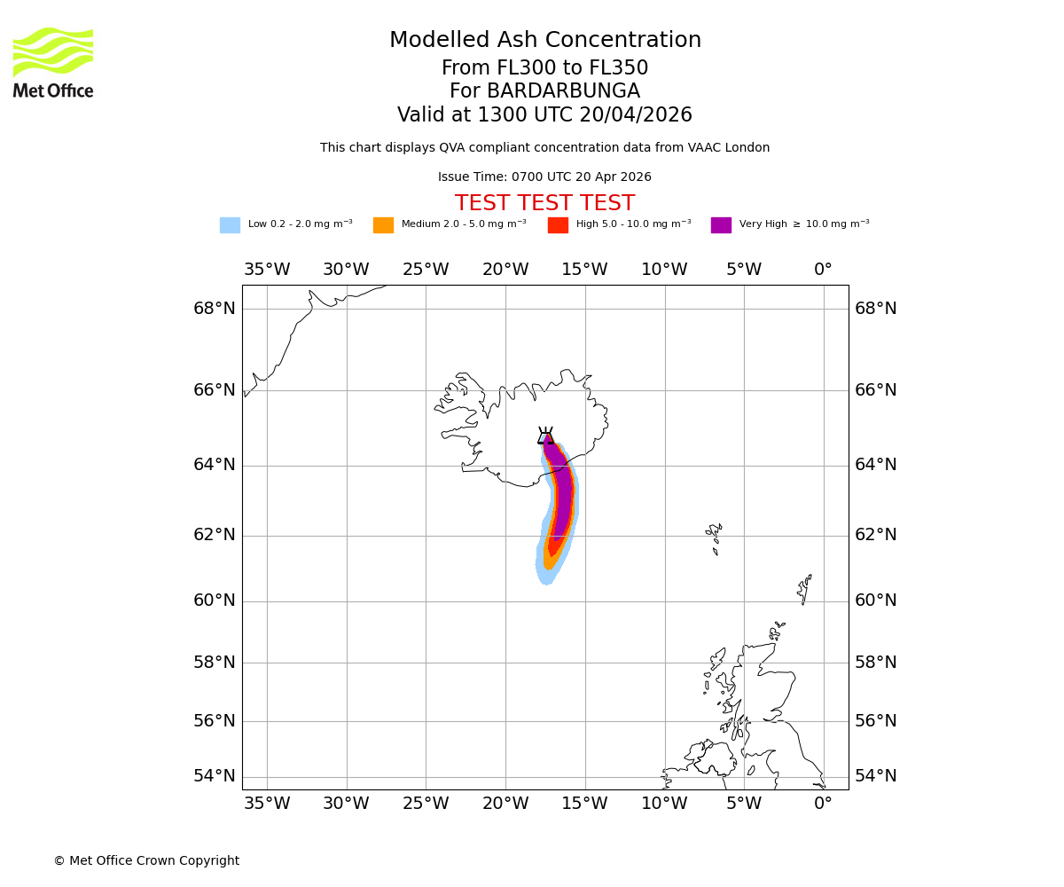 Modelled ash concentration from 300 to 350 for BARDARBUNGA. Valid at 1000 UTC 20/04/2026
