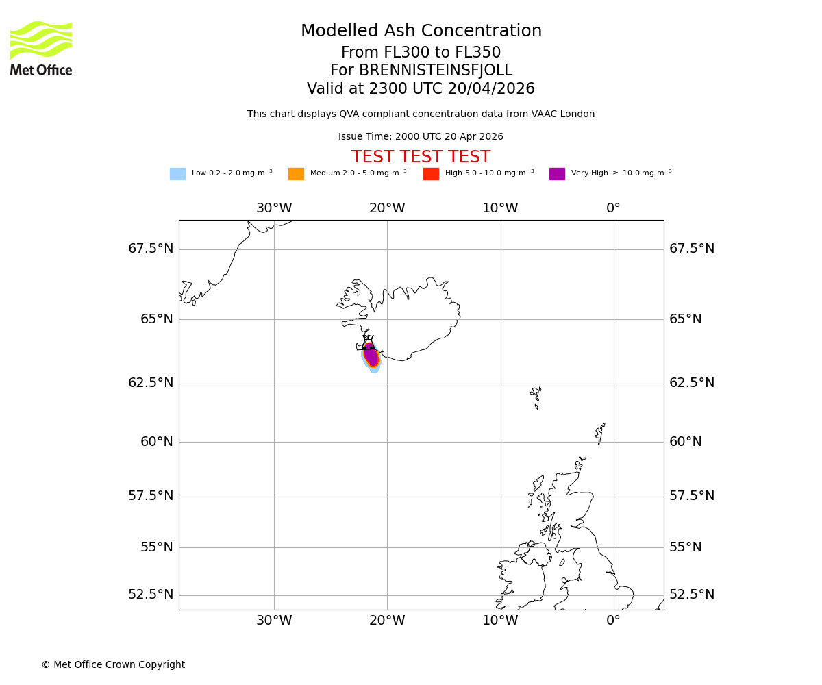 Modelled ash concentration from 300 to 350 for BRENNISTEINSFJOLL. Valid at 2000 UTC 20/04/2026