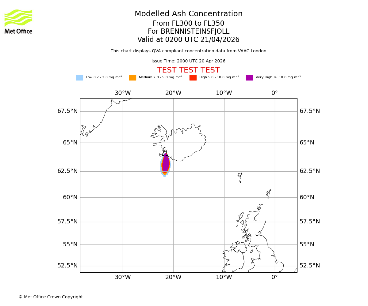 Modelled ash concentration from 300 to 350 for BRENNISTEINSFJOLL. Valid at 2300 UTC 20/04/2026