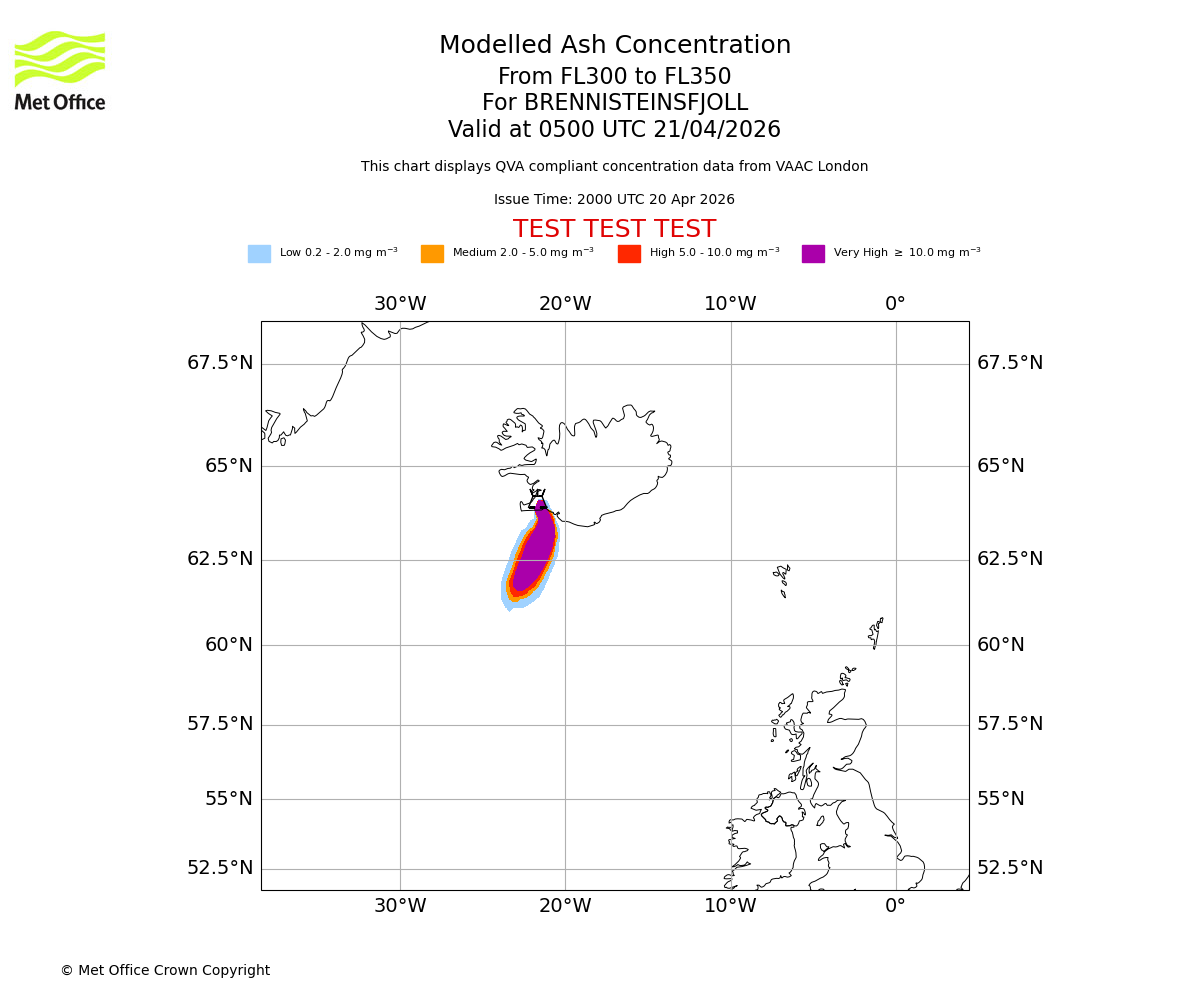Modelled ash concentration from 300 to 350 for BRENNISTEINSFJOLL. Valid at 0200 UTC 21/04/2026
