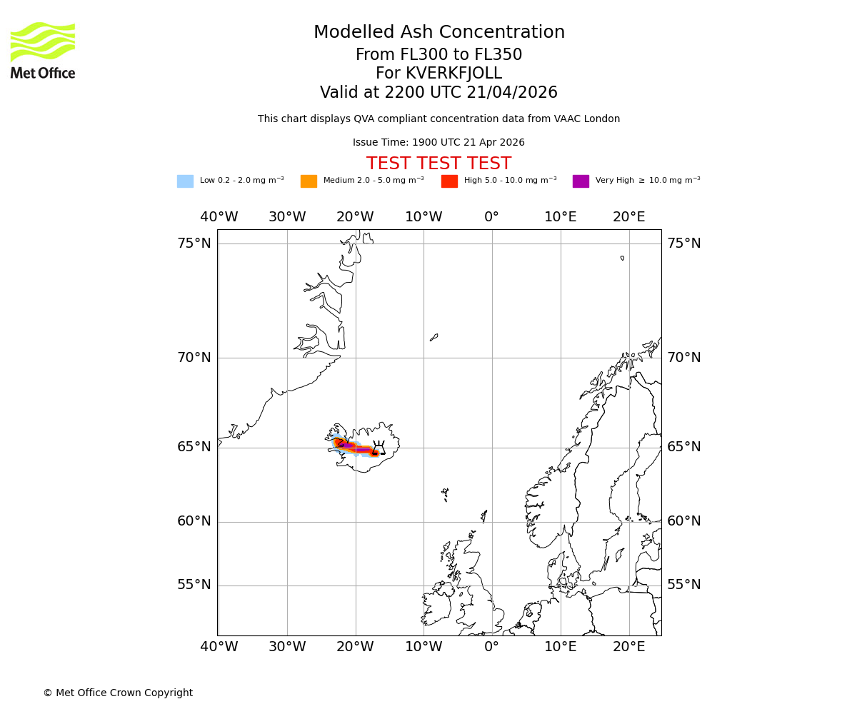 Modelled ash concentration from 300 to 350 for KVERKFJOLL. Valid at 1900 UTC 21/04/2026