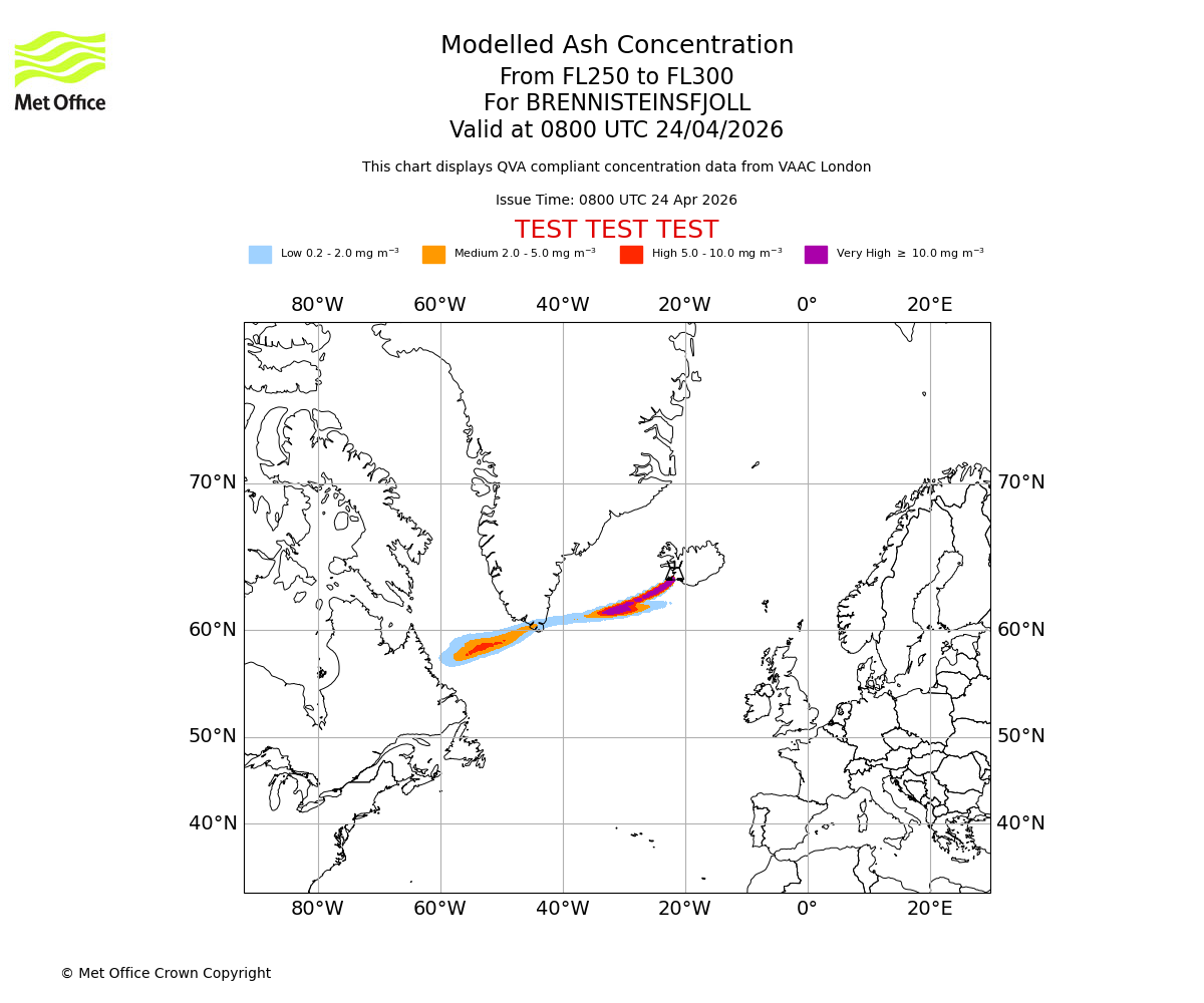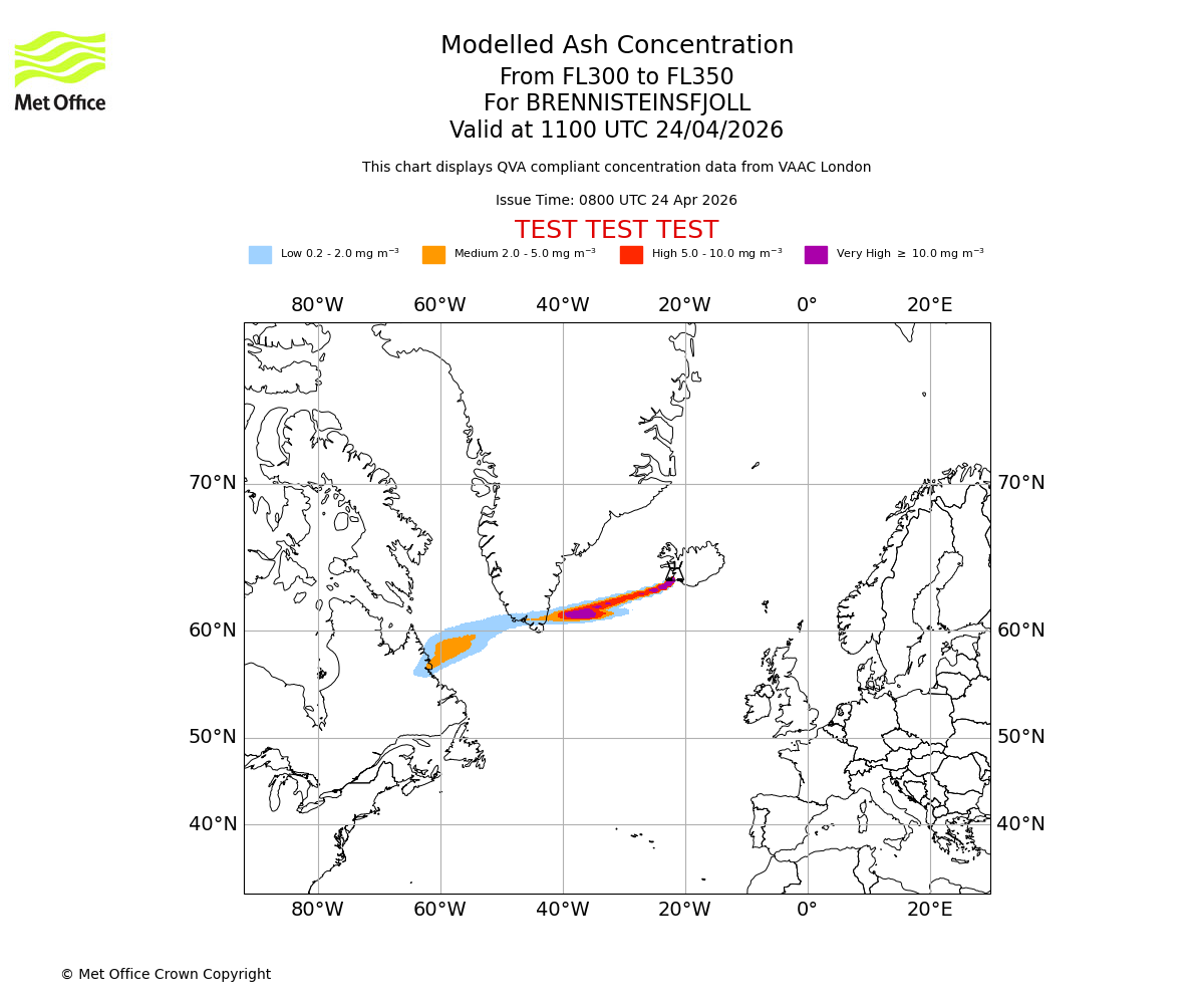 Modelled ash concentration from 300 to 350 for BRENNISTEINSFJOLL. Valid at 0800 UTC 24/04/2026