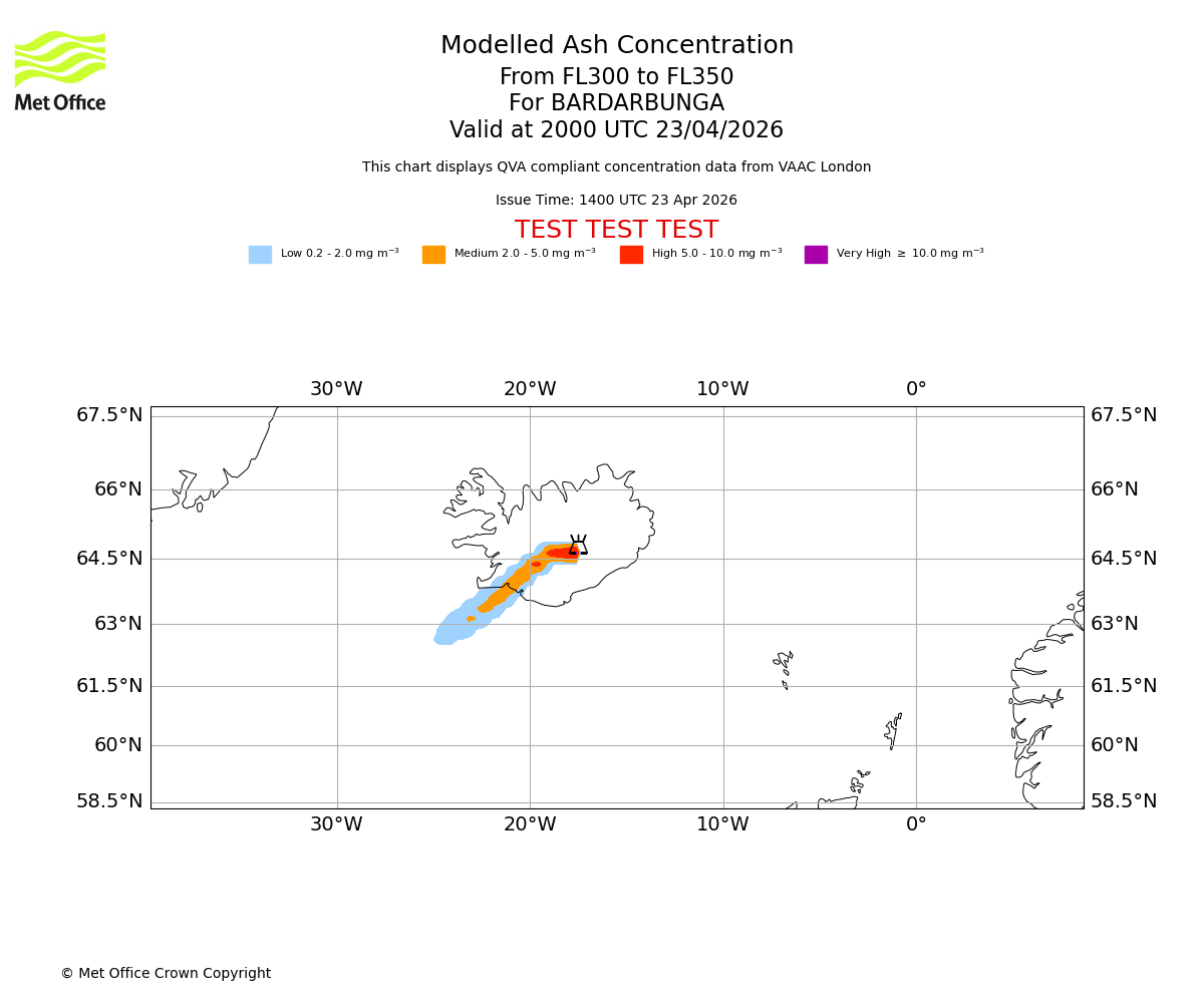 Modelled ash concentration from 300 to 350 for BARDARBUNGA. Valid at 1700 UTC 23/04/2026