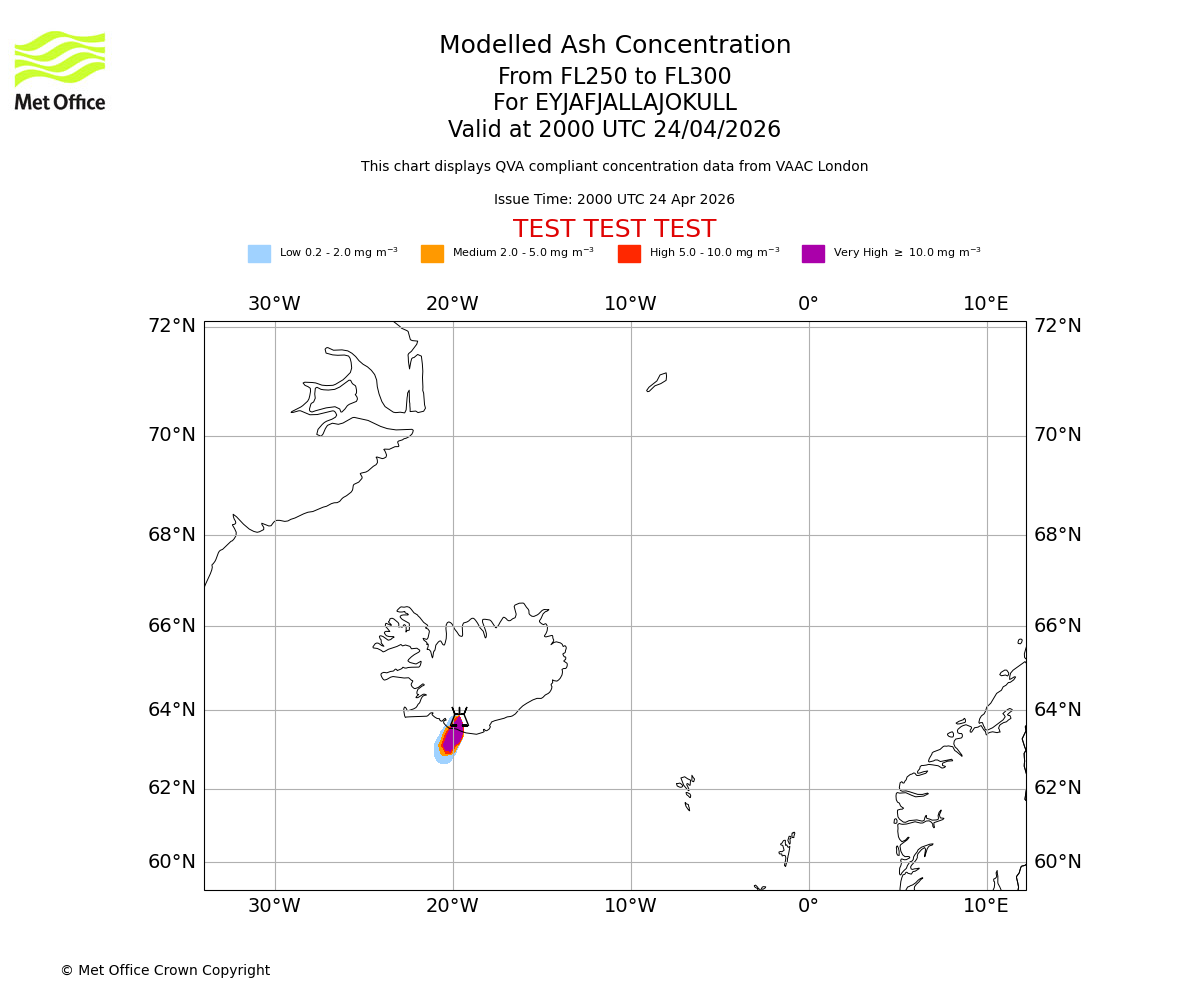 Modelled ash concentration from 000 to 200 for EYJAFJALLAJOKULL. Valid at 2000 UTC 24/04/2026