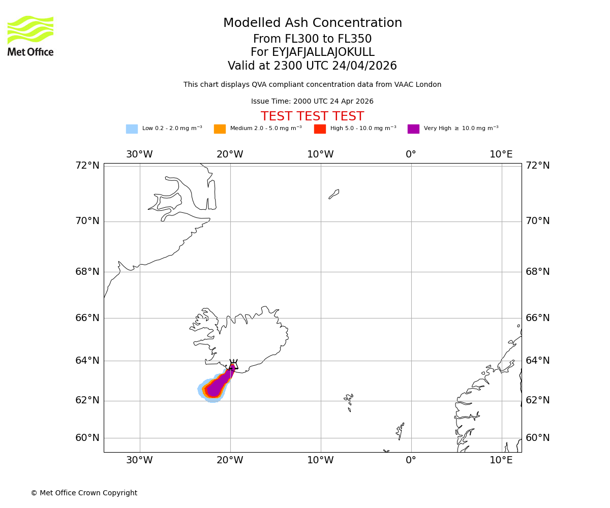 Modelled ash concentration from 300 to 350 for EYJAFJALLAJOKULL. Valid at 2000 UTC 24/04/2026