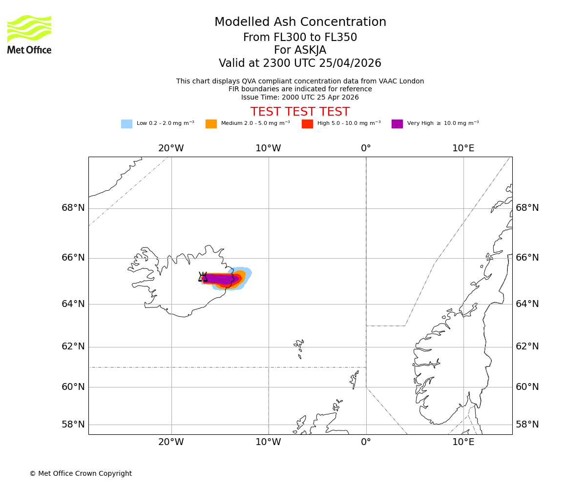 Modelled ash concentration from 300 to 350 for ASKJA. Valid at 2000 UTC 25/04/2026