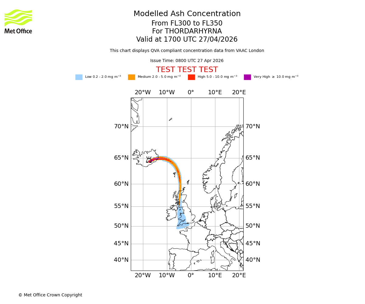 Modelled ash concentration from 300 to 350 for THORDARHYRNA. Valid at 1400 UTC 27/04/2026