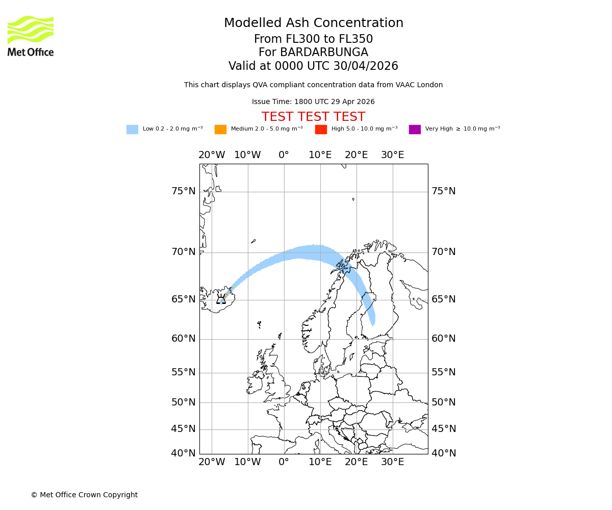 Modelled ash concentration from 300 to 350 for BARDARBUNGA. Valid at 2100 UTC 29/04/2026
