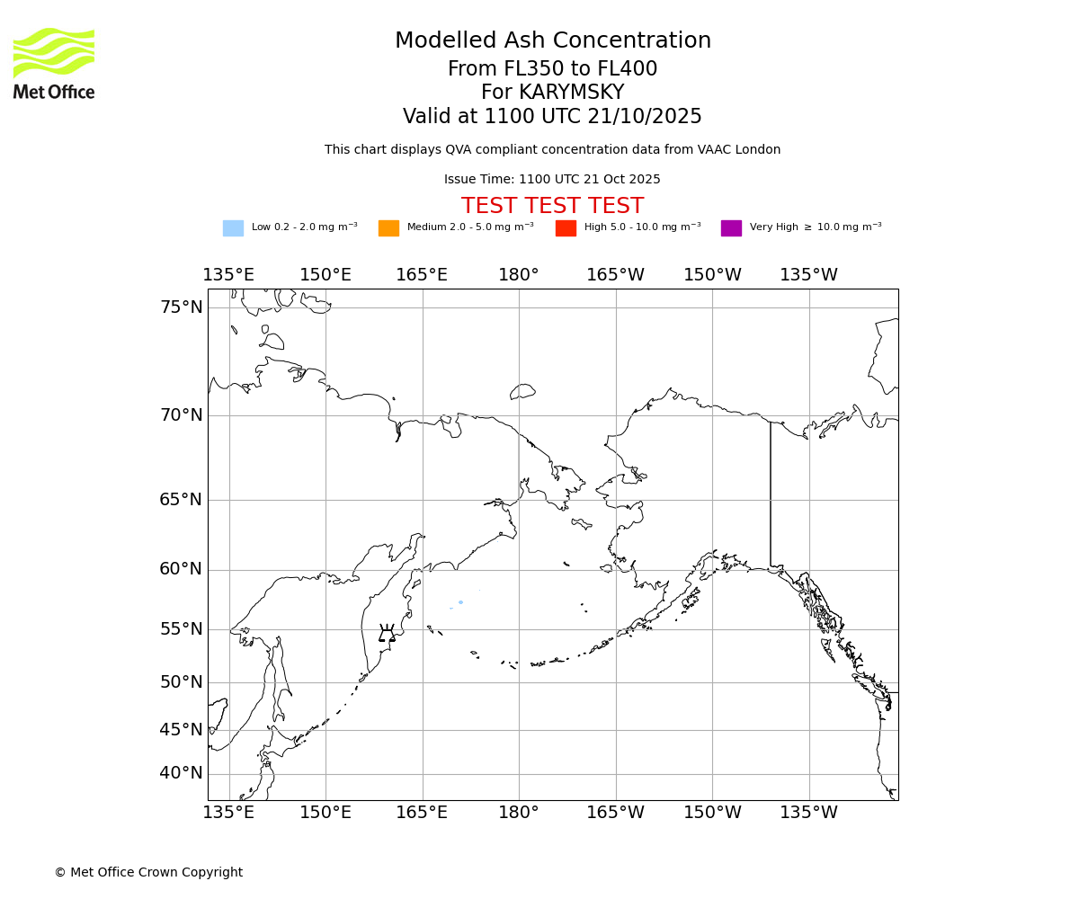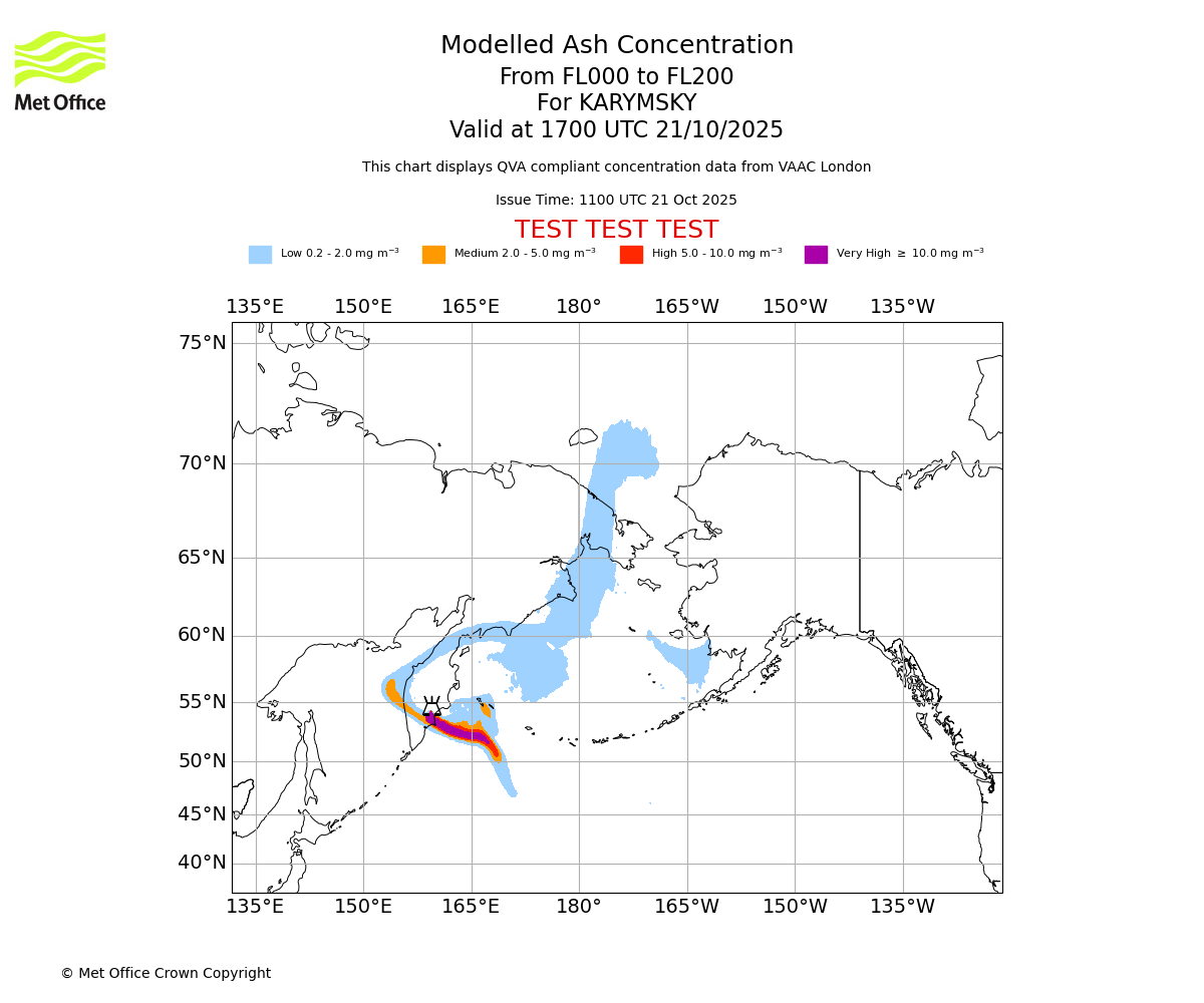 Modelled ash concentration from 000 to 200 for KARYMSKY. Valid at 1100 UTC 21/10/2025