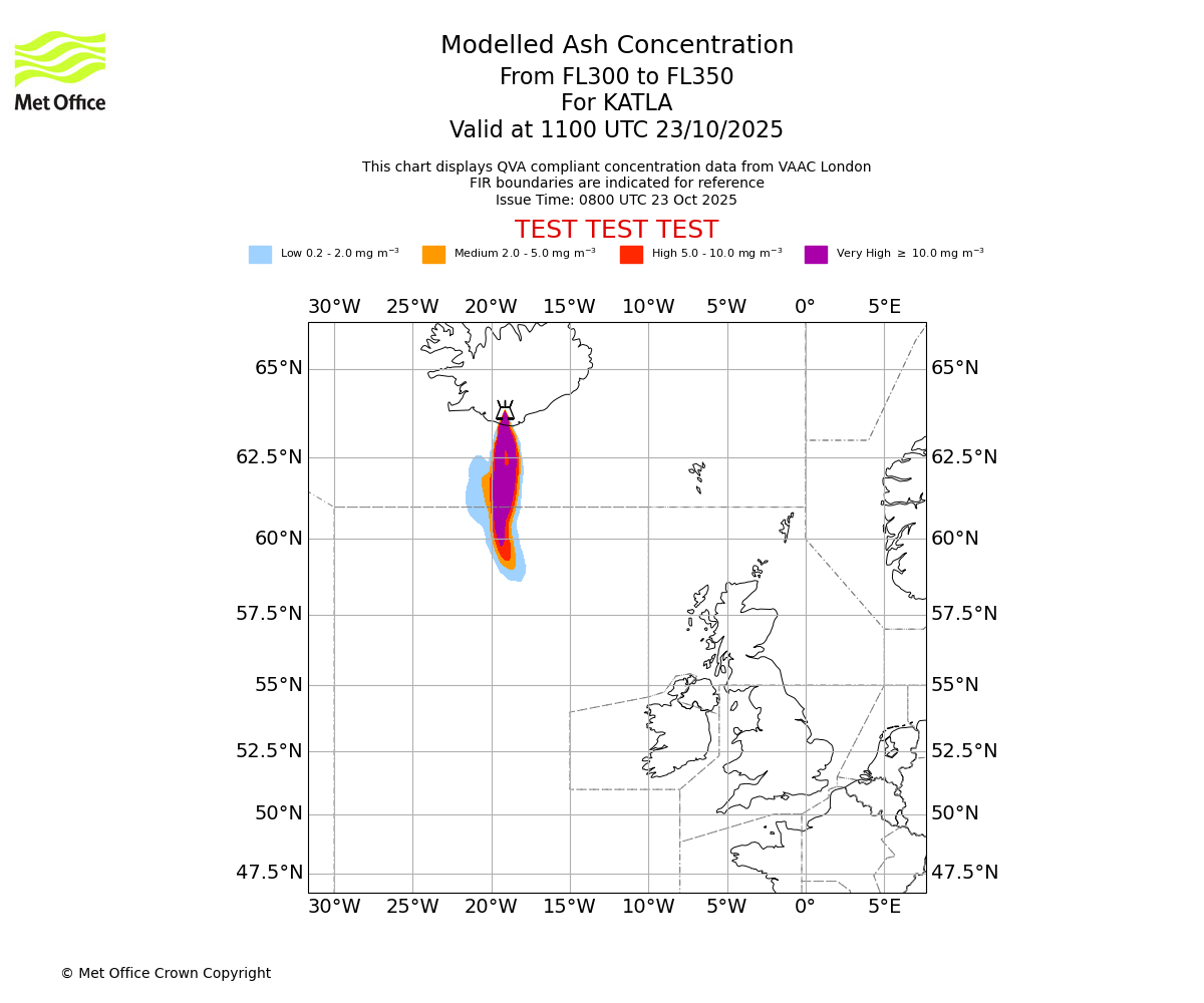 Modelled ash concentration from 300 to 350 for KATLA. Valid at 0800 UTC 23/10/2025