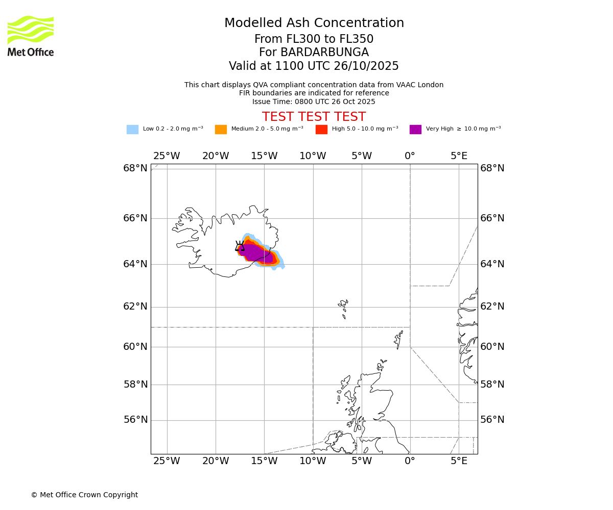 Modelled ash concentration from 300 to 350 for BARDARBUNGA. Valid at 0800 UTC 26/10/2025
