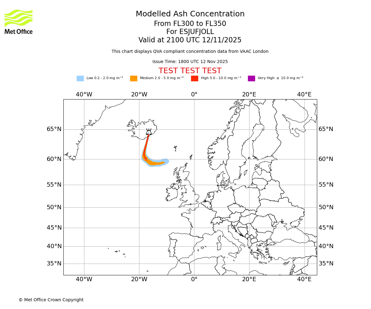 Modelled ash concentration from 300 to 350 for ESJUFJOLL. Valid at 1800 UTC 12/11/2025